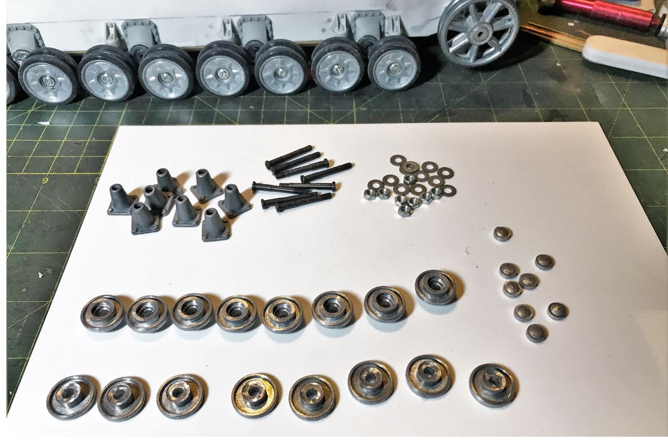 These are the parts assembled for the return rollers. There are Mato late Panzer IV all metal rollers and Asiatam metal mounts, nuts and bolts.