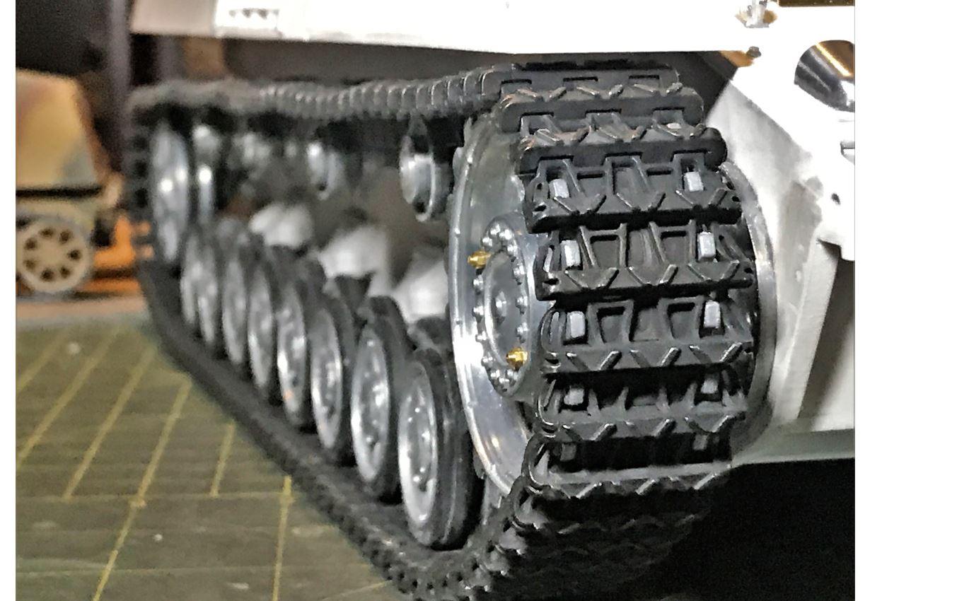 These are the superb and relatively cheap Mato MT011T panzer IV metal tracks (black pre-painted), purchased from eBay China for about $55. Notice the great level of details compared to Heng Long plastic tracks. They come with track pins with heads that allow for easy manipulation. Whoever has tried to remove track pins that are fully embedded inside a metal track link know what i am talking about. I do not think i will ever buy another set of Panzer IV tracks than these.