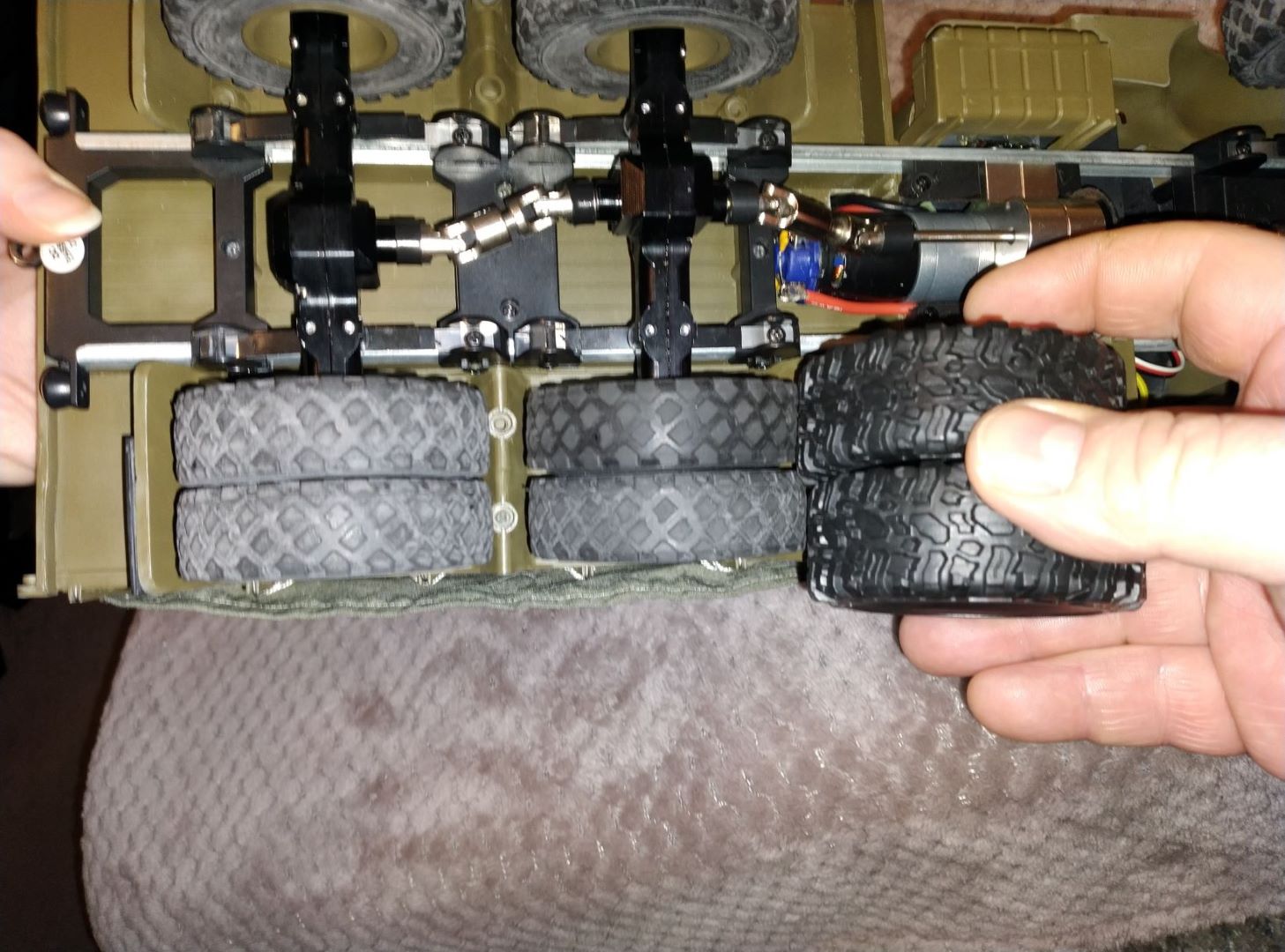 I bought a metal drive axle, a centre metal through axle and a metal steering axle I then separately bought a set of eight double wheels plus a matching pair of singles from Banggood for a 6x6 jjrc truck which came with matching tyres,