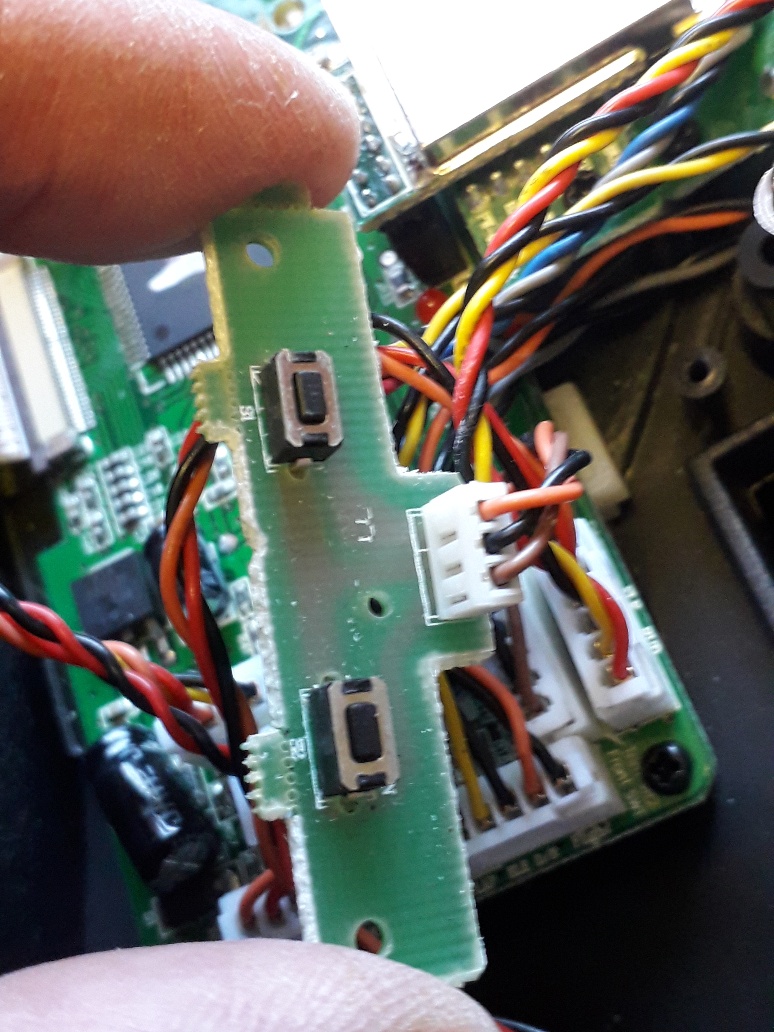I removed the actual lever from its holder, this is a T piece affair with the central bit where your thunb goes to move the trim, the cross piece of the arm left / Right has two lobes on it that depress each momentary switch left / right to adjust trim from center, again both looked to the eye ok, i then put slight up pressure on each lobe to simulate the pressure that it would encounter when pressing each momentary switch and Eureka i found the issue, one of the arms holding the lobe had cracked just where it fits to the upright T piece so moved up when pressure was applied away from the momentary switch so it did not have enough rigidity left to depress the switch, infact the next time i touched it it fell off the T.