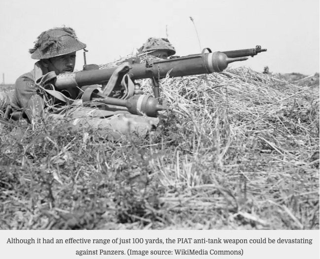 Perhaps folk have been too quick to write the Piat, or, Projector Infantry Anti-Tank- off :) At 100m, it had a greater effective range than the early Panzerfaust (30m), was reusable, and didn't blow holes in anyone unfortunate to be behind it. Then again, It could only penetrate 100mm (4 in) of armour- but could, and did knock Panthers out, whilst the early Panzerfaust could manage 140mm; but the operator had to be perilously close to the target to hit it. The PIAT had an indirect range capability of over 300m. It did have problems with dud fuses, and could give the operator's should a hefty kick, but continued to be used even after the war (The North Vietnamese used captured Fench examples, apparently). It was also highly effective against concrete emplacements, and houses.