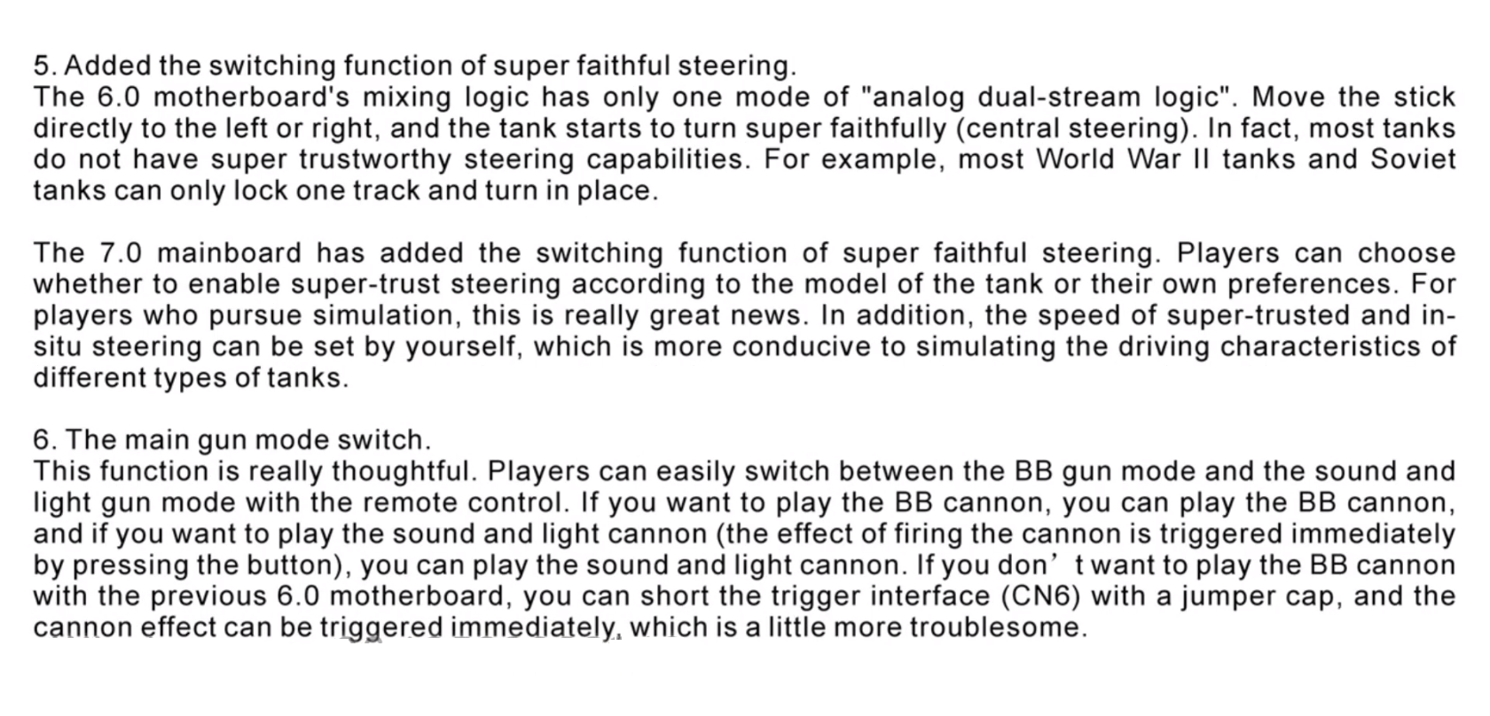 Well. For me, this is quite a serious lack - I would prefer one polished sound package that I can edit and load myself. But the extra sero for the periscope and the ability to set (or turn off) the braking force made me very interested in this version of the MFU (7.1). It is a pity that I have to buy another remote control again ... I think this is a serious problem for me due to the inability to connect a standard RC receiver ... But HL has once again made a great step towards a professional RC tank electronics. I hope that they are constantly listening to customers and that the next upgrade will meet my expectations 100% :)