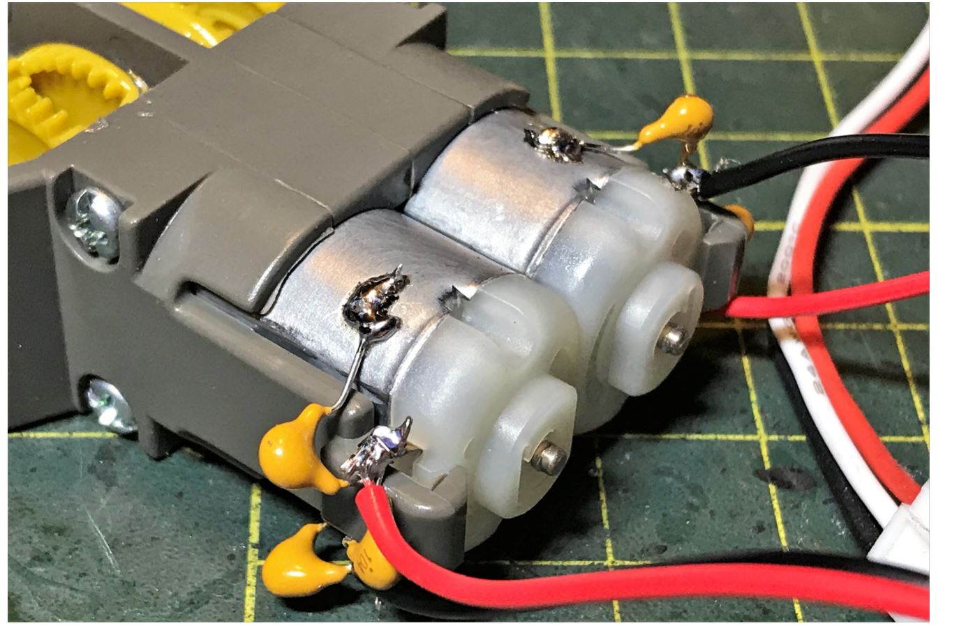 One capacitor is installed between the + and - connectors, and then between each connector and the metal casing of the motors.