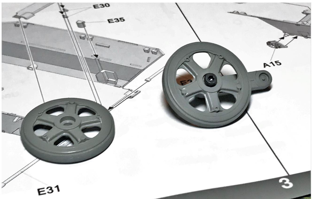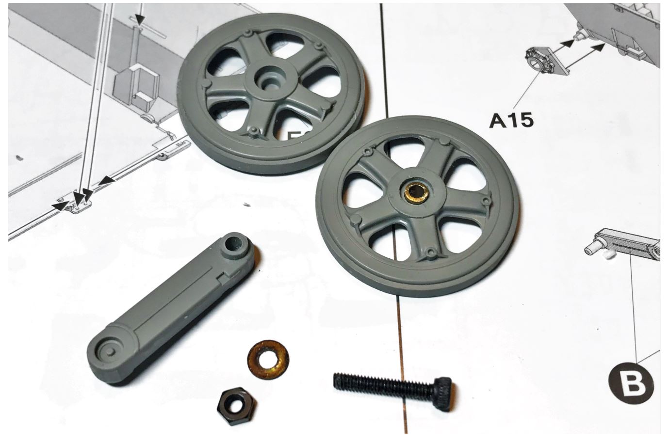 The plastic axles for the roadwheel are simply replaced by M2 hex bolts with a brass rim inserted into the inner roadwheel after drilling the required central hole.