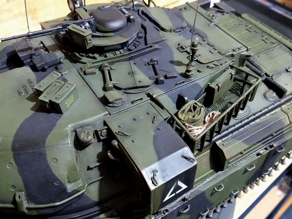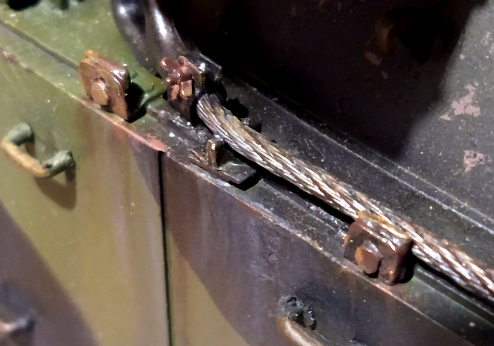 handles that festoon the 'bazooka plates' (skirts to me). For practicality I used stiff wire sheived with shrink wrap - I just knew that being a working RC model any paint would otherwise wear off very quickly. The glacis plate casting effects can now be seen, as can the mud flaps and the bazooka plate fixings and tow cable fittings (all missing previously). Notice, in particular, the cutaway to the corner of the triangular storage bin, this is not present on the left side bin.......