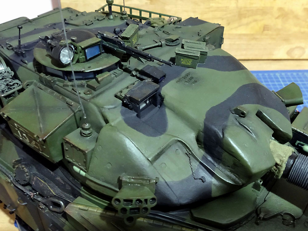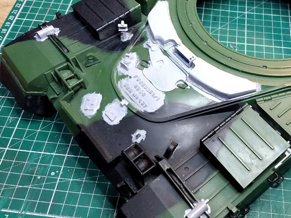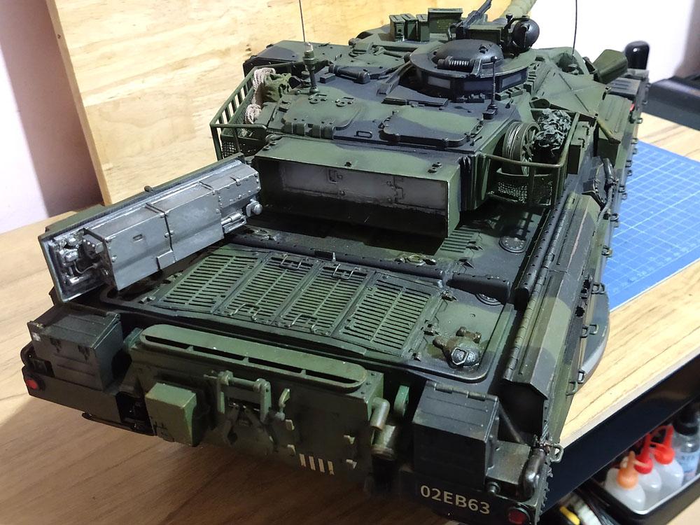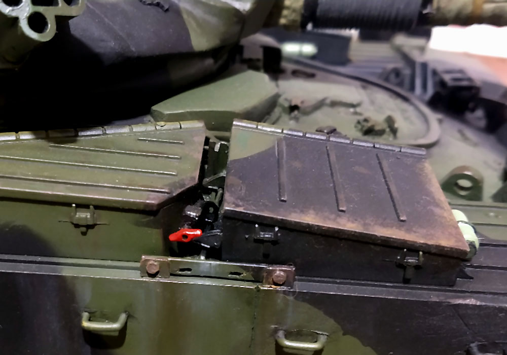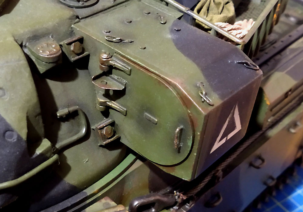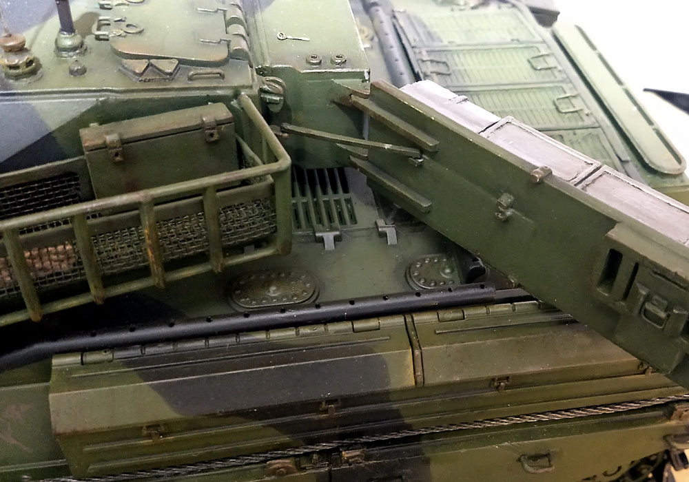 handles that festoon the 'bazooka plates' (skirts to me). For practicality I used stiff wire sheived with shrink wrap - I just knew that being a working RC model any paint would otherwise wear off very quickly. The glacis plate casting effects can now be seen, as can the mud flaps and the bazooka plate fixings and tow cable fittings (all missing previously). Notice, in particular, the cutaway to the corner of the triangular storage bin, this is not present on the left side bin.......