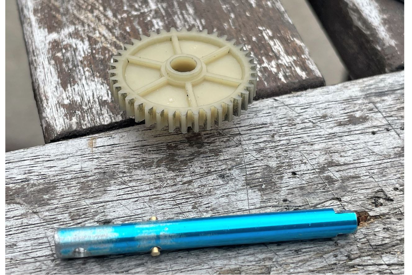 Reused the discarded plastic gear and the leftover from the metal shaft. A hole for the connection to the drive shaft was made, and a anchor pin was inserted at the proper location for the gear. Being aluminum, this took at few minutes.