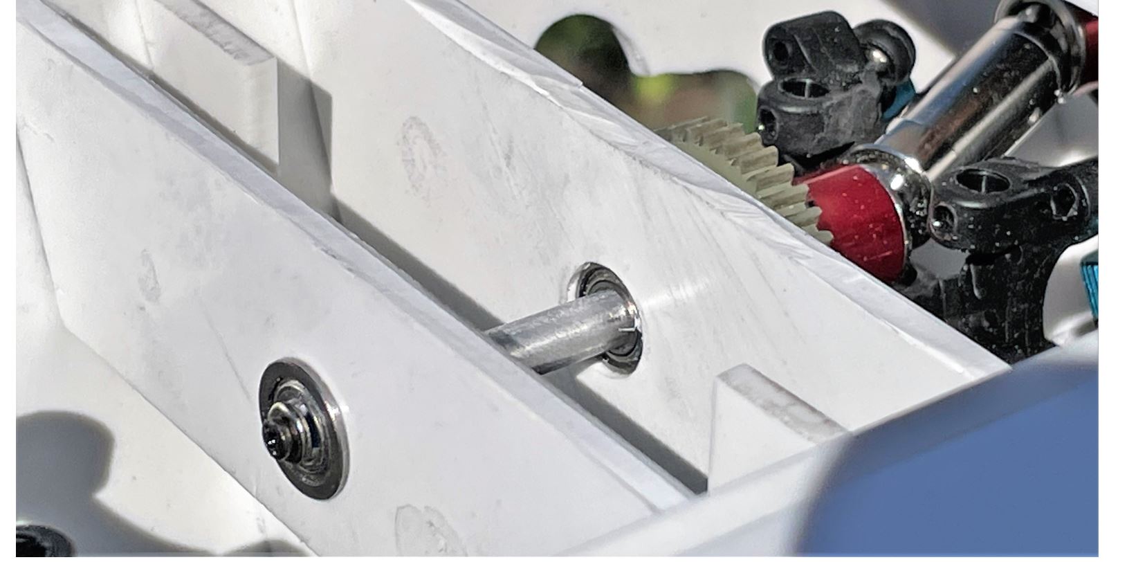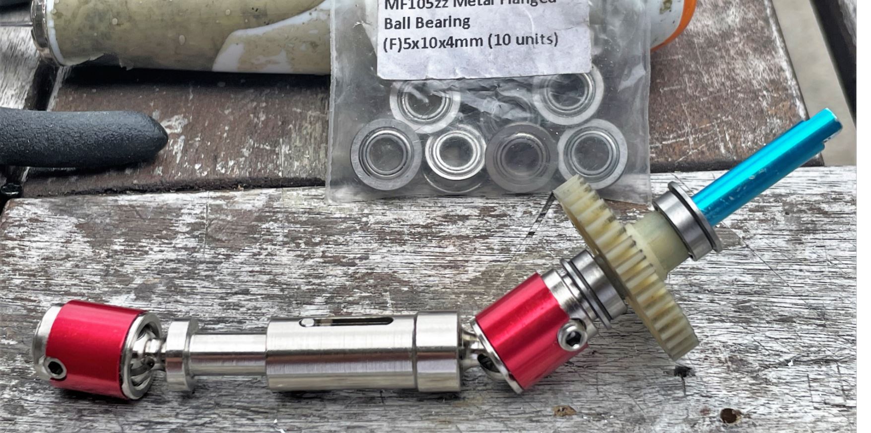 A small bolt with a washer against the flanged ball bearing at the tip is holding the shafts in place, squeezed between the two ball bearings. I am making use of the pre-drilled hole and bolts at the tip that came with the leftover of the upgraded metal drive shaft. Never discard anything...