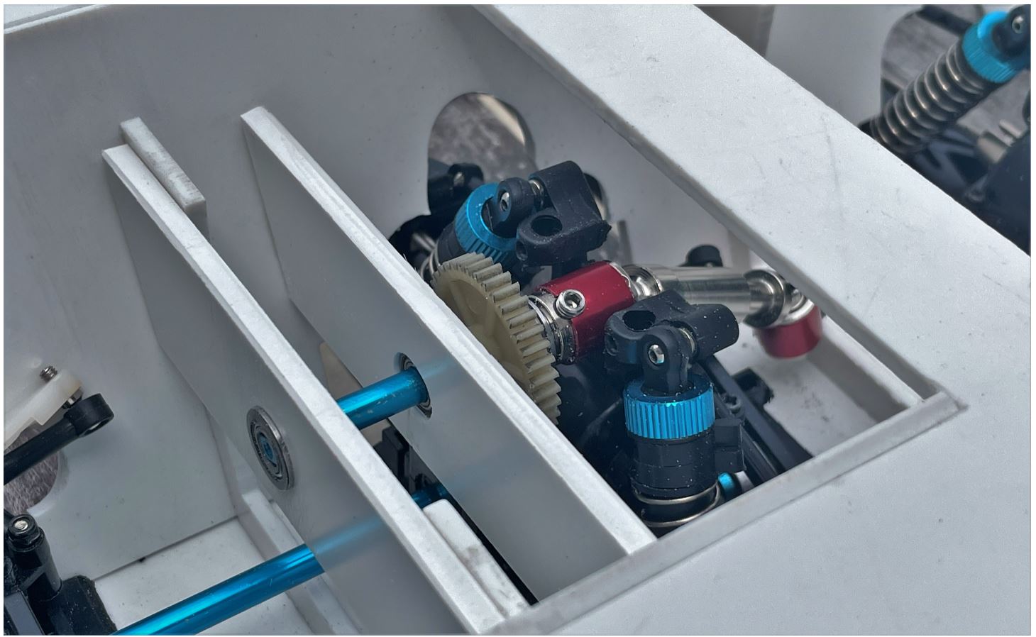 Chris did a bad joke on me. I assumed the positioning holes for the suspension were centered with the external body. They are not... I had a small shock when i dry fit the skirts and noticed the misalignment. Very annoying, i had to reposition the suspension module A and B, reinstall them more forward and redo the shaft integration. I few hours of rework. Be warned. Make sure to align the suspension with the skirts first, no assumptions.