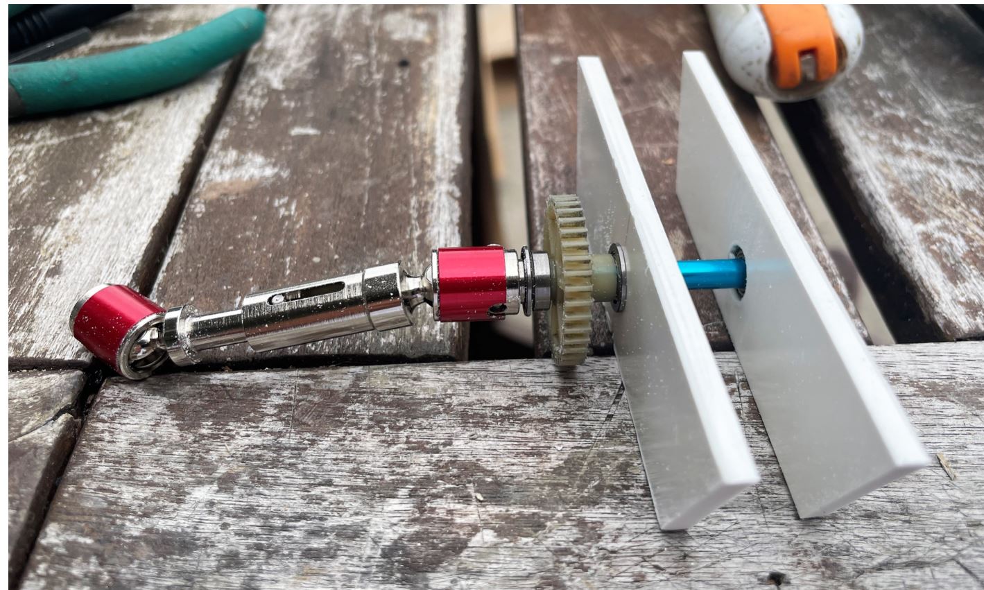 Reused the discarded plastic gear and the leftover from the metal shaft. A hole for the connection to the drive shaft was made, and a anchor pin was inserted at the proper location for the gear. Being aluminum, this took at few minutes.