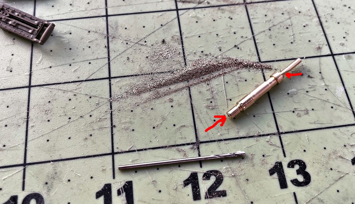 However, on the larger and nicely rendered section, it can be drilled through to allow a small fiber optic cable to be inserted inside. You can see where the drill bit exited, not all the way through but on the side. At that point, the barrel is inside the Browning body and this is where i want the fiber to be coming out.