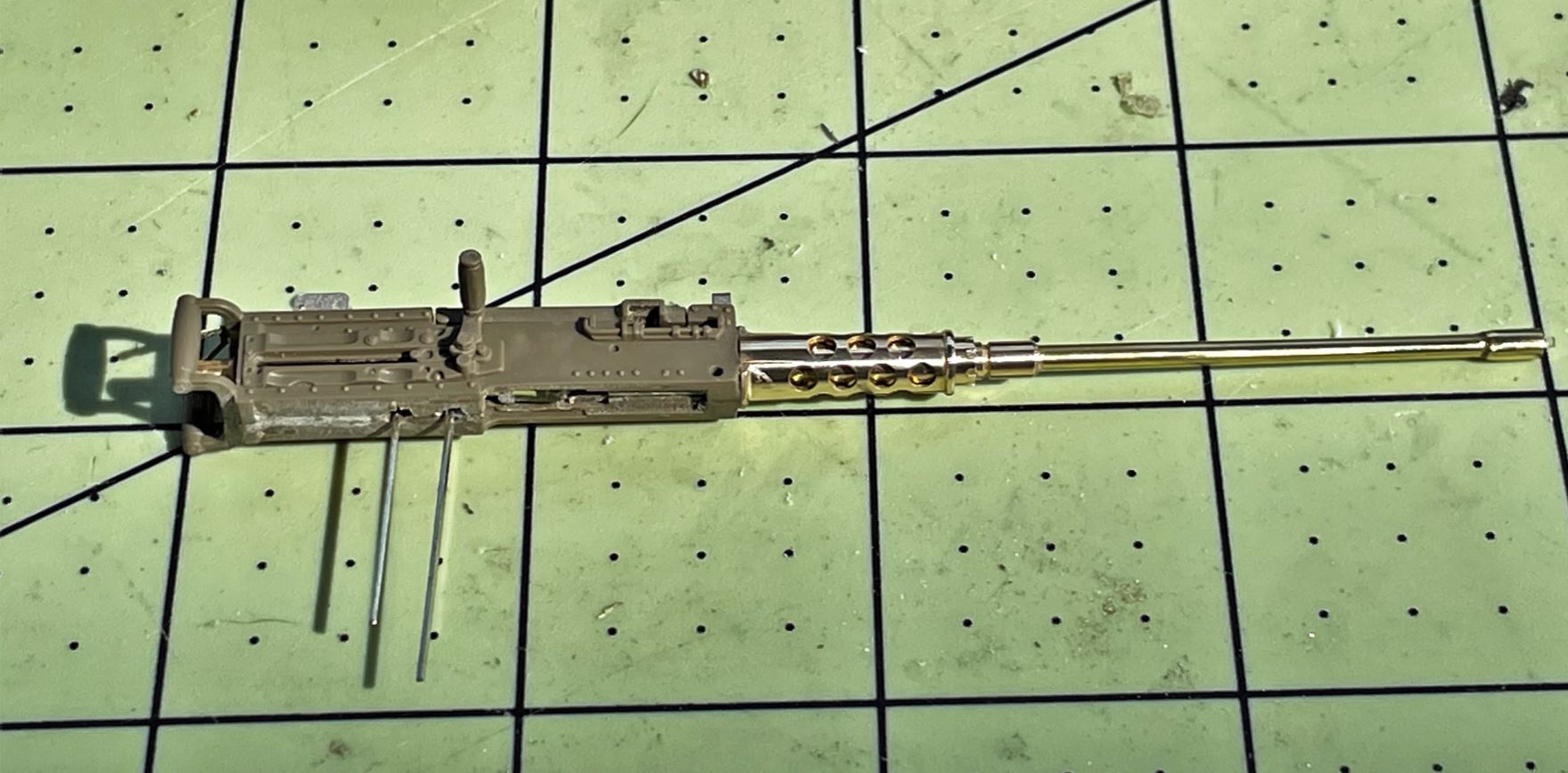 Switching to the machine gun for now. I have done this many time now. The Aber 16L-04 is used to replace the Tamiya M2 plastic barrel. However, because i want flash, a good portion of the Aber barrel (the thin section) will be replaced by a 2mm brass tube because it is impossible for me to drill through that solid thin barrel. Shown here is where the Aber barrel has been cut, the small section is discarded.