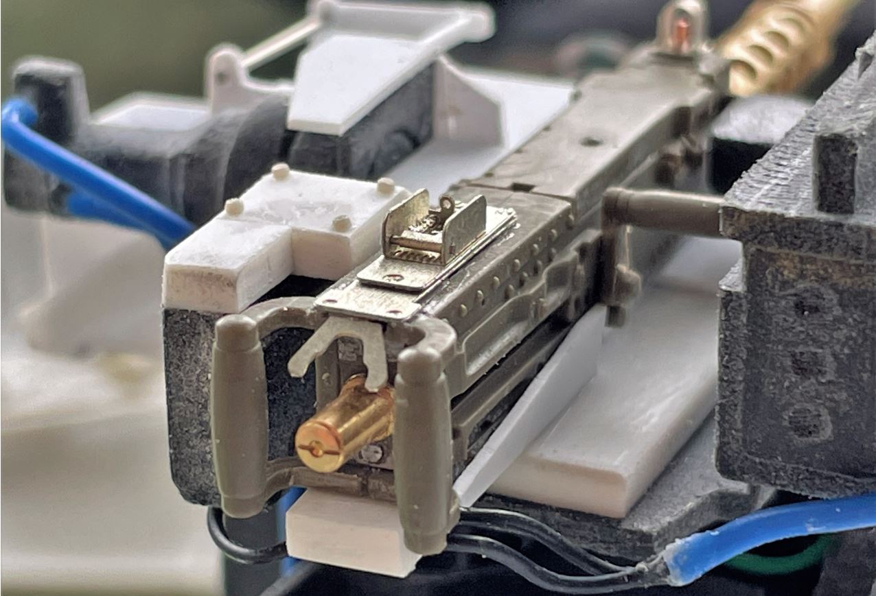 Room is made inside the Tamiya body for the LED and fibre optic that runs under the barrel brass stub. I have opened a window to the breech in order for the yellow light to illuminate the breech with fire when the browning is firing, this should provide interesting special effect when shooting at night.