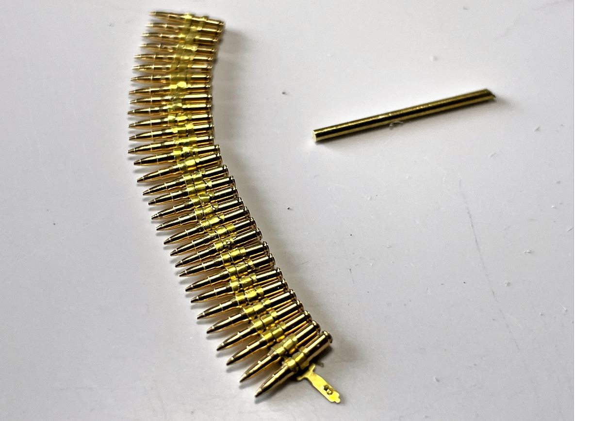 Need to show some ammos in the ammo box and feeder. I was disappointed with past experiences with resin ammo, expensive and in the end, not that great. This time, i am going with the Aber 16-130 kit which provide 30 brass rounds and links to assemble a flexible belt for a realistic display, at about the same cost.