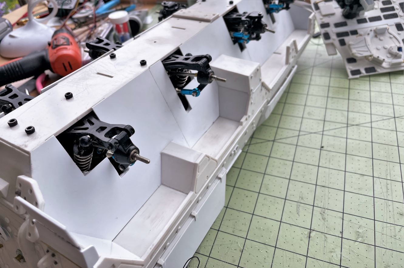 Views of the completed under fenders. Notice that the second hub must not be closed. It has no bins or structure under it like the others, it is just some armor plate between the wheel 1 and 2 and need to be left as is.