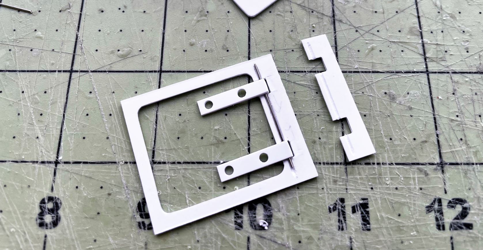 The side doors are complex to reproduce and quite rich in features, including holes for 20 bolt heads of two variations that need to be done with the basic tools that i have. The door is positioned prior to gluing the operable hinges on its flat surface.