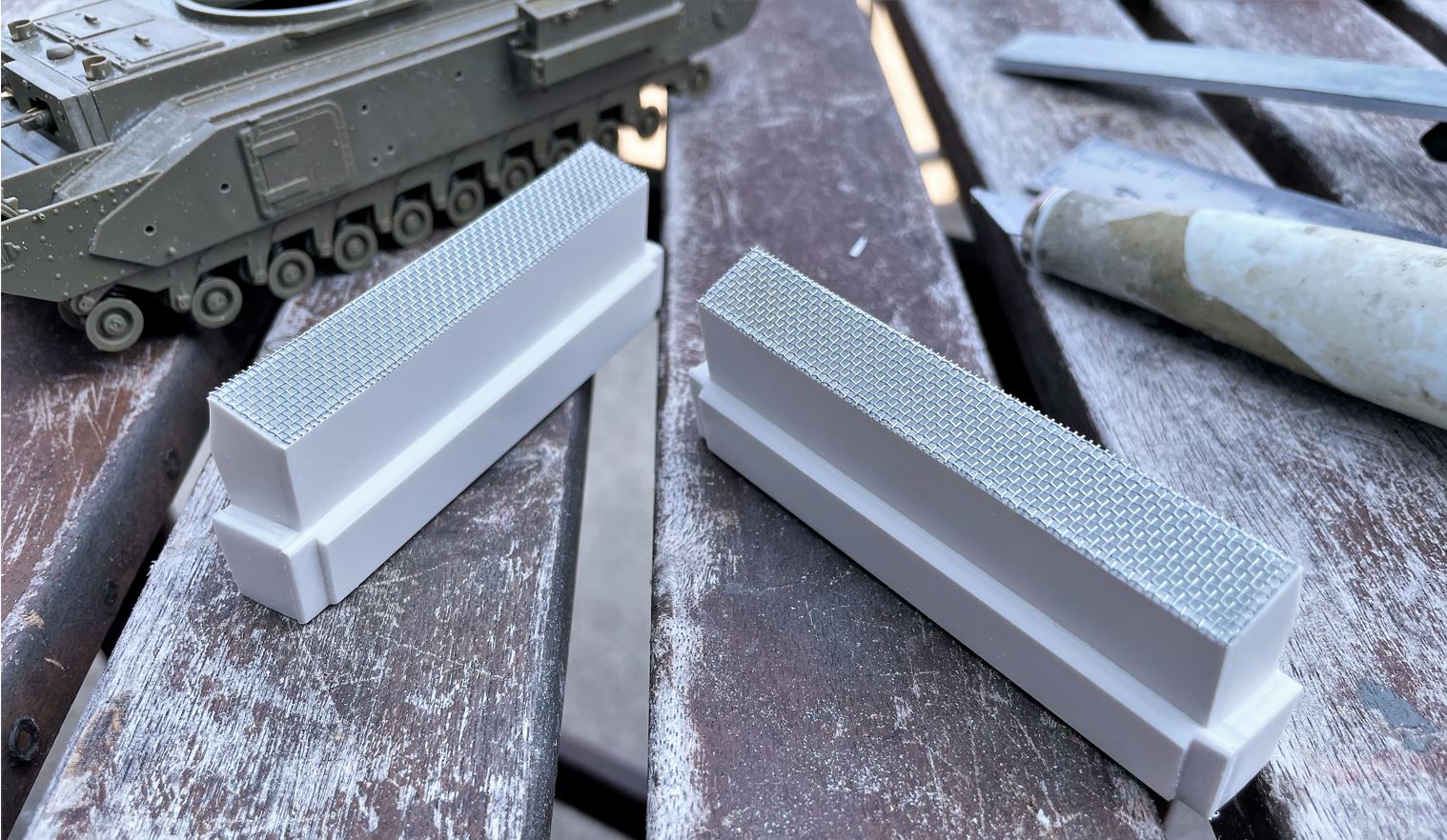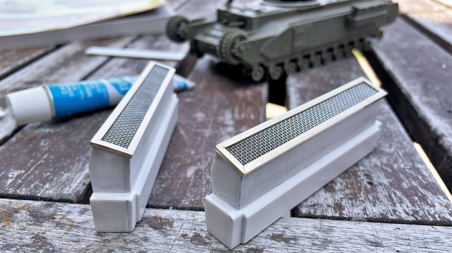 After some scratch detailing for small features seen on the AFV club kit, the air intakes are finished and ready for installation on the tank.