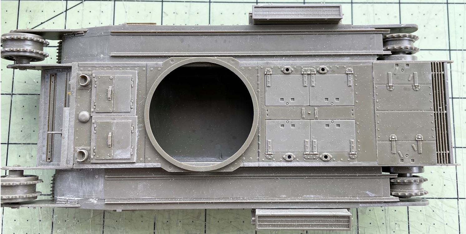 View of the raised driver and machine gunner's hatches on the AFV Club kit. Notice the position of the upper deck within the side armor, not sitting on top.