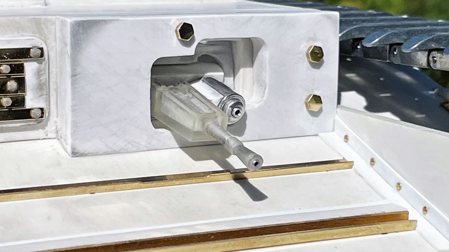 View of the mount inserted into its box shaped secondary mount for horizontal movement. This part is put aside for now until the bow plate is finished.