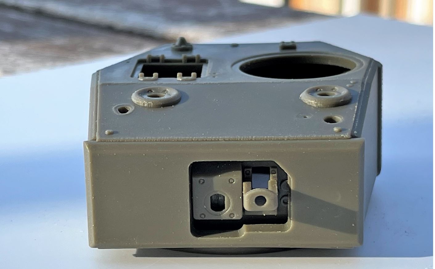 The finished gun mantlet with the side mount braces that are actually coming from the Ludwig kit, the only thing reused for the turret. They needed to be shortened later.