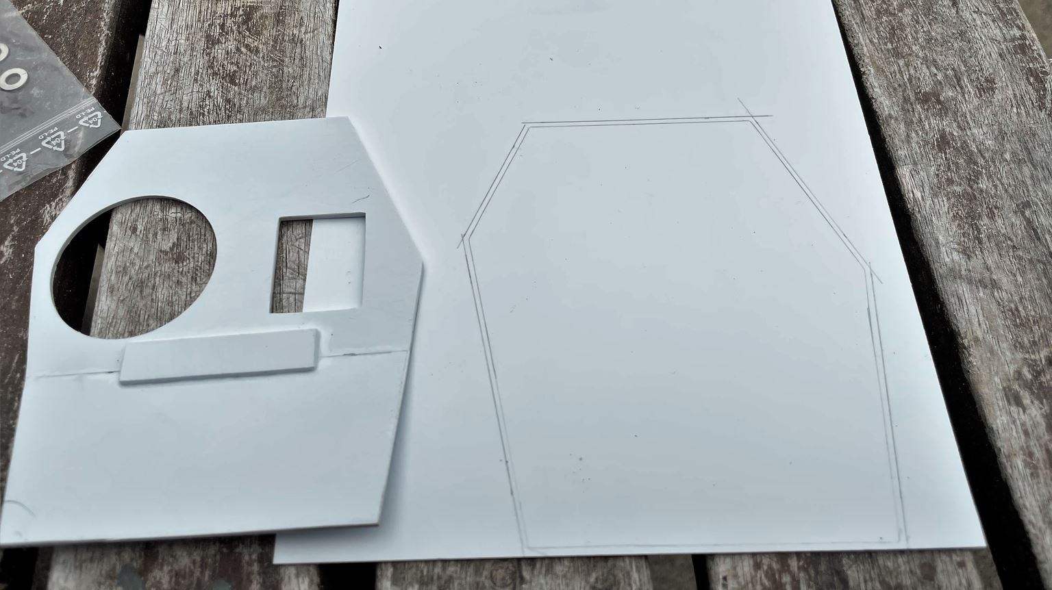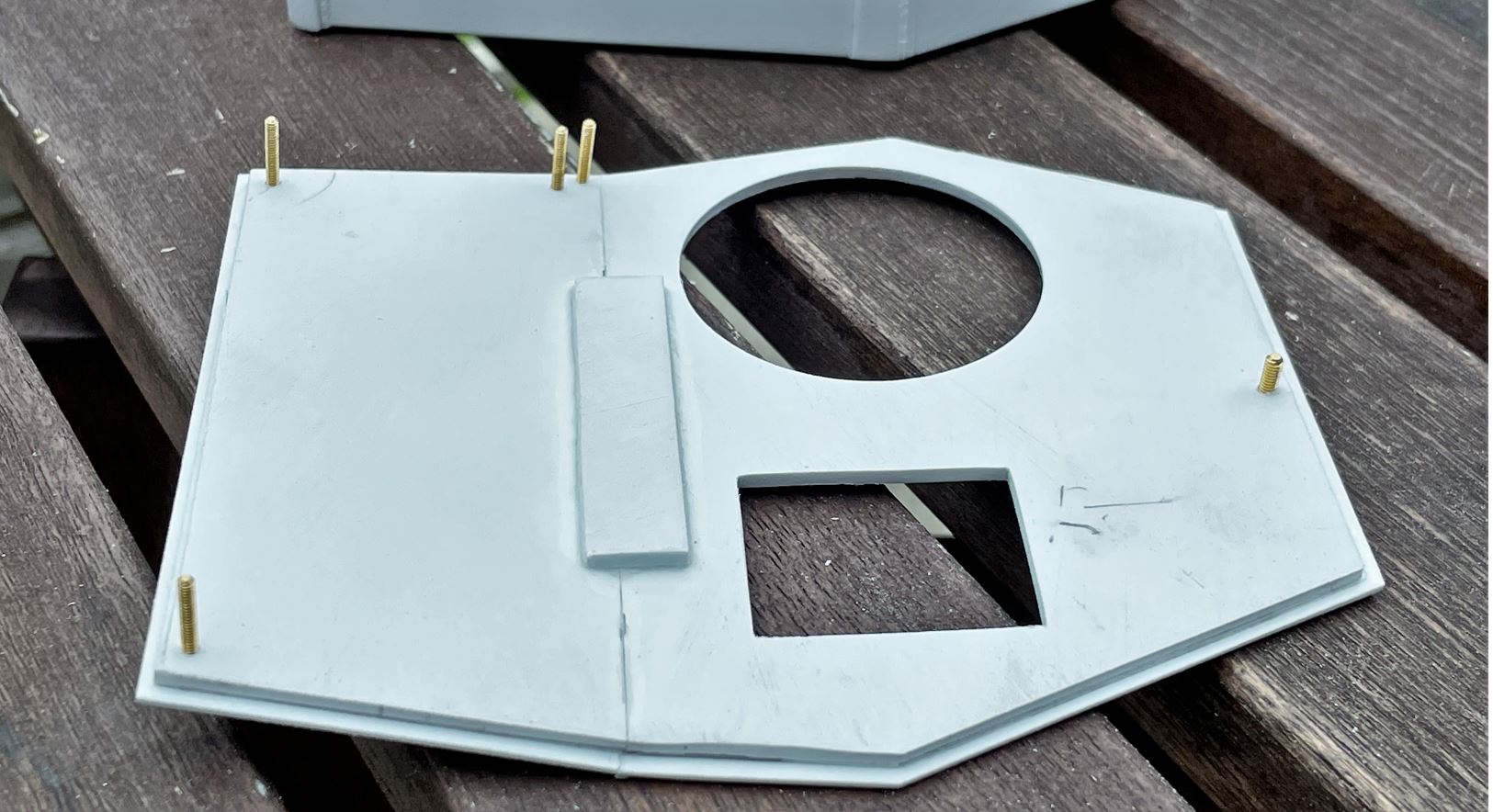 All the facets are created in 2mm plasticard. In order to achieve the armor thickness and simplify the creation of the angles of the side armor. Two layers of 2mm plasticard will be glued together on all sides. The base will be a simple 2mm card, while the roof will be a 2mm support base with a 1mm overlay protruding on the side armor a bit as seen further above.