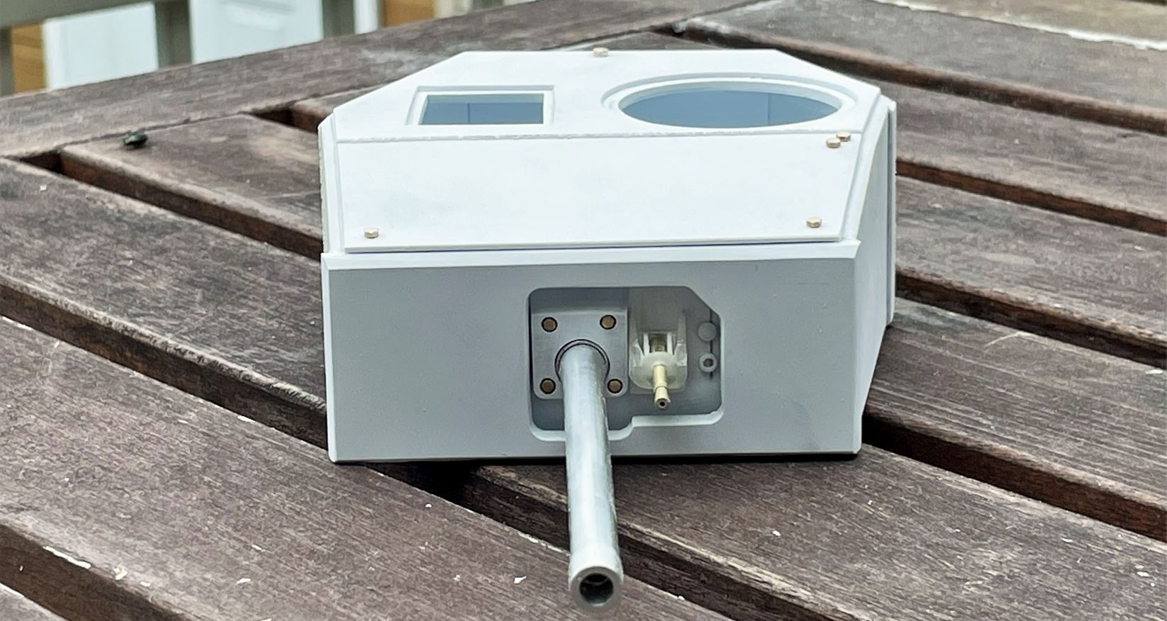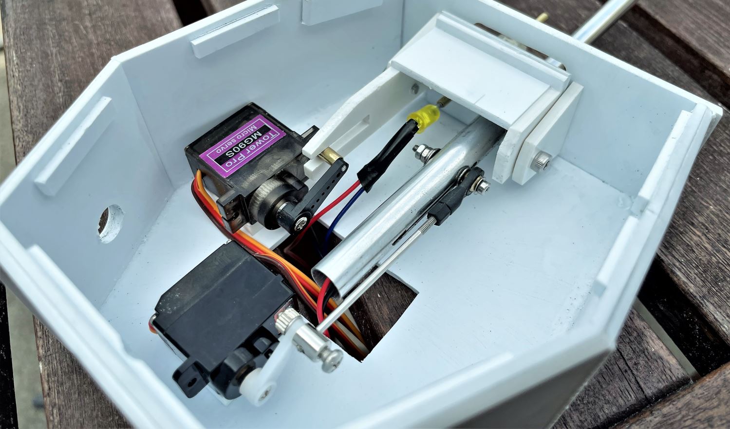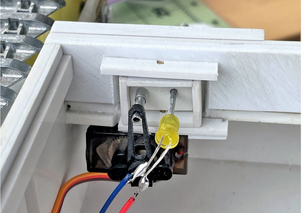 The electronics for the bow machine gun. A 5mm LED connected to the fibre optic aluminum tube, and a micro servo installed under the glacis that activates the machine gun left and right in some uneven (desired) movement.