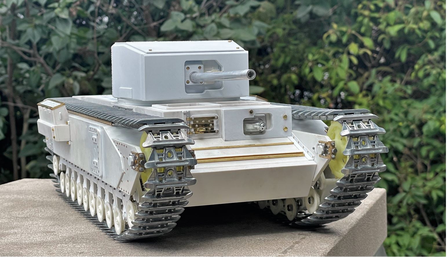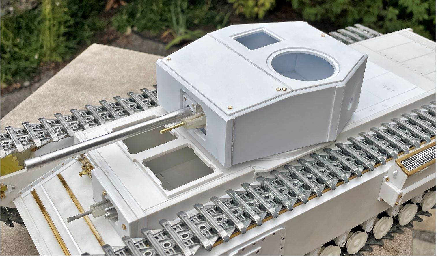 View of the turret core simply deposited on top of the chassis for a first look at the shape of a 1/16 RC Churchill Mk III, surely a rare sight.
