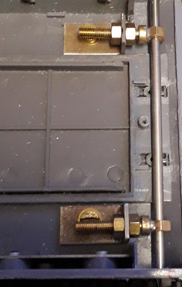 1/16 thick steel bent to 90 degrees to the height of the axle and drilled to bolt to the hull and for a 2ba brass bolt to pass through with 2 nuts either side of the steel bracket, a further 2 ba nut soldered onto the end of the bolt head which the 4mm axle is a good snug fit with no play, to adjust the tension on either track just undo and tighten the corresponding nuts, which moves the axle and lock it up.