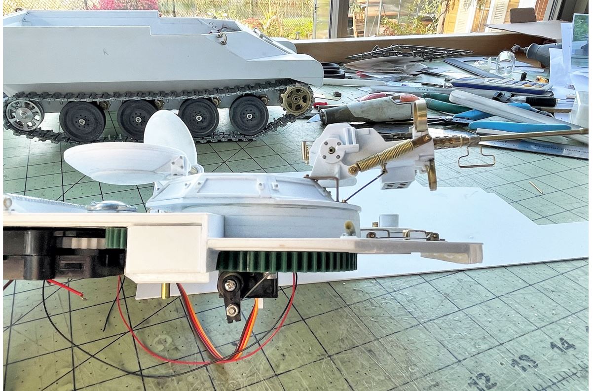 In this view, you can see the wire end to end from servo to gun mount, going through the cupola. The wire is flexible and will bend for a good elevation and lowering of the machine gun.