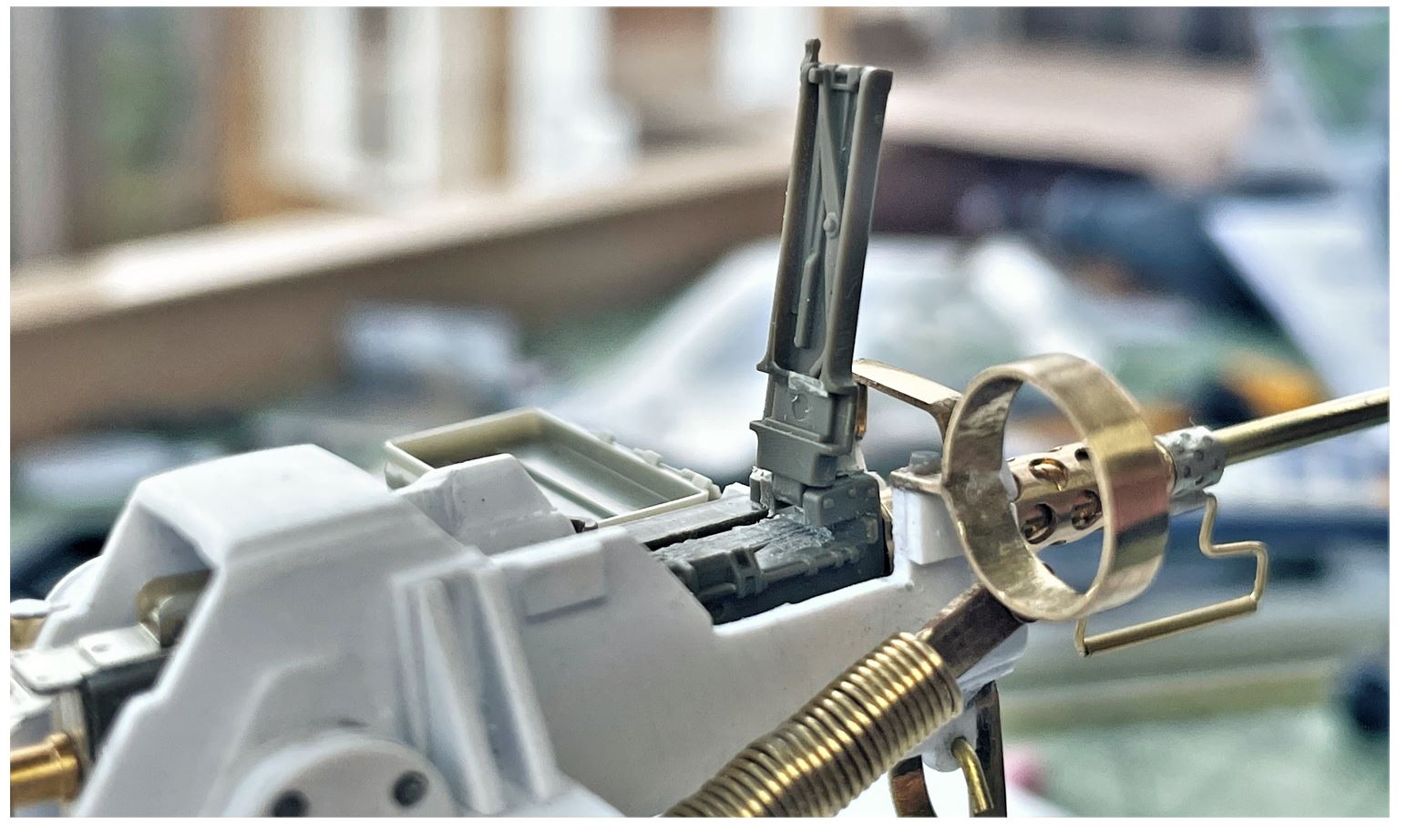 The connection under the gun mount. I tried to make it look as best as it can under the mount, and is partially hidden by the large spring on the side.