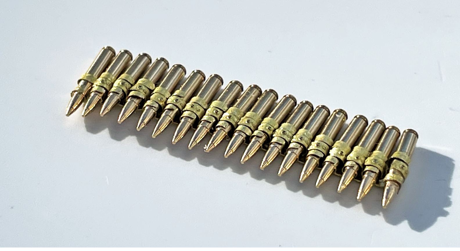 And after no more than 3 medium level curses and a couple of mental health breaks, here we have an 12.7mm ammo belt for the Browning M2, done in about 2-3 hours end to end. Not perfect but keep in mind these are really small. I had to put two pairs on glasses on to see anything a bit more clearly. Yeah, there are simpler alternatives but they do not look as good. Plus, I like the challenge.