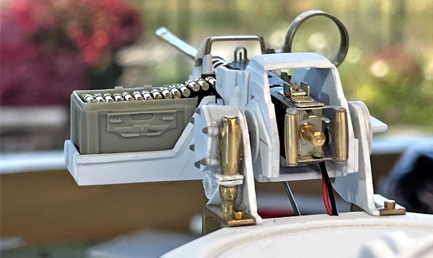 The Browning M2 is begging for ammo. Notice the flash wires on the right going inside the cupola, then strait down to the interior of the vehicle, next to the elevation servo.