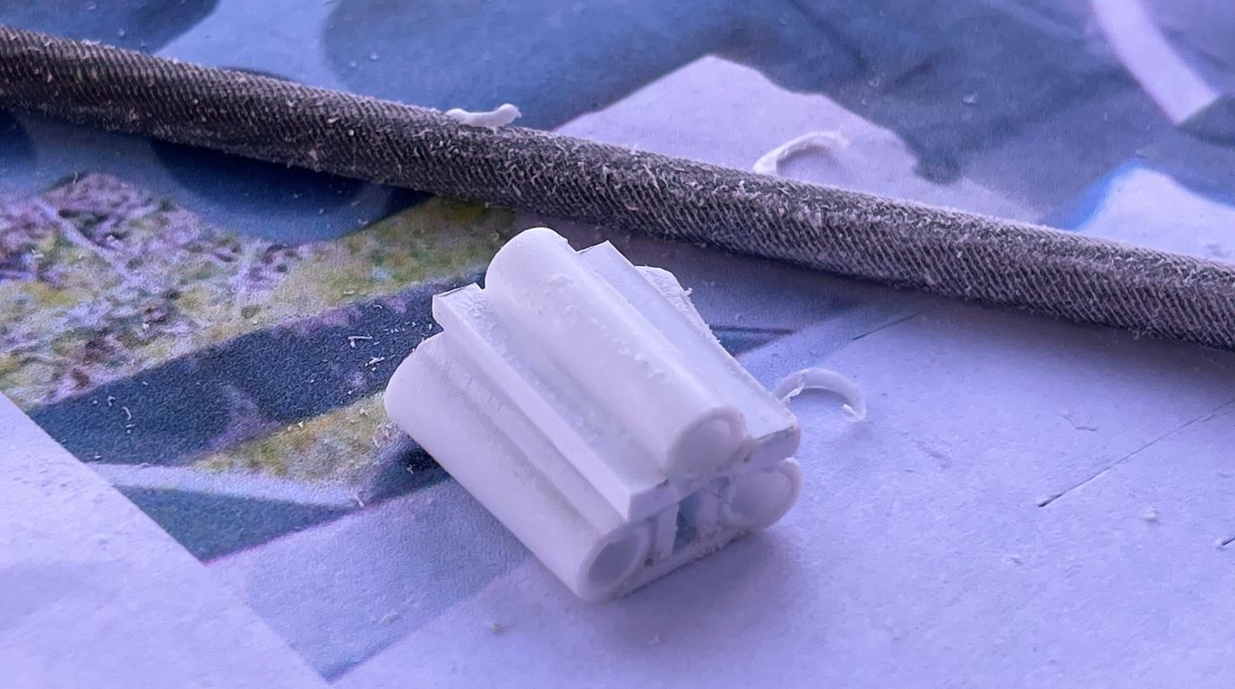 A large solid plasticard rod is used to carve some shapes with a nail file to apply to the back of the lights. The interior is drilled with a drill bit.