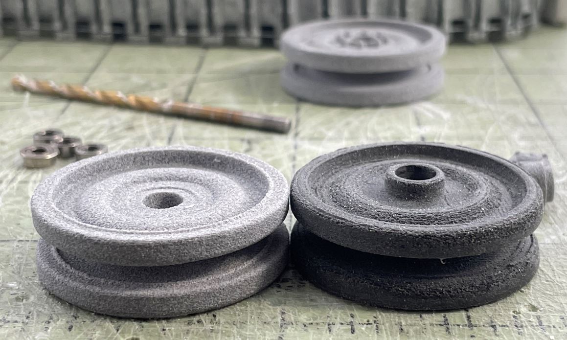 Chris changed the design of the back of the wheel, new model of the left, old one on the right. The printed inner rim now has to be replaced with metal washers, a good idea.