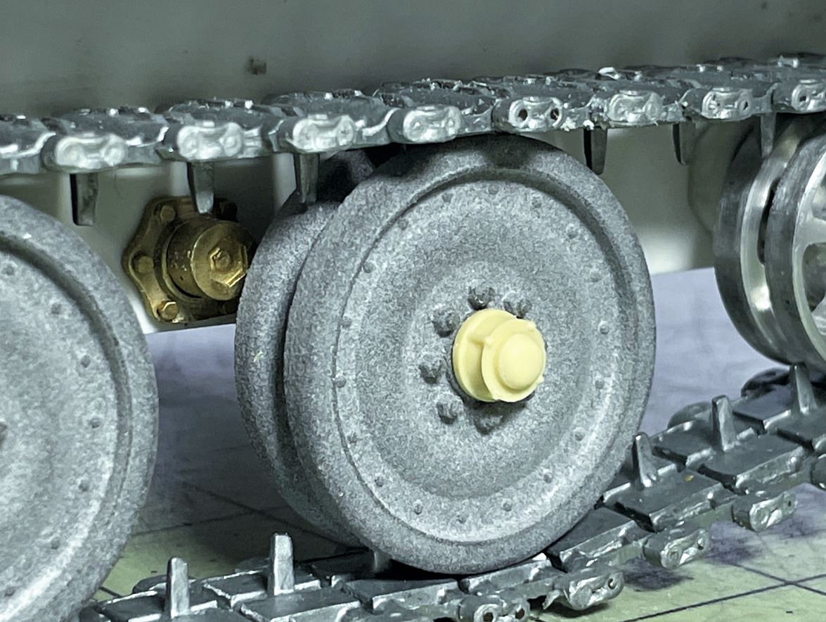 Close up on the primed Ludwig M113 roadwheels with modified Tank Modellbau hub caps. I am very satisfied with the overall look and detail of the roadwheel with the new material that Chris used. It's a real improvement.