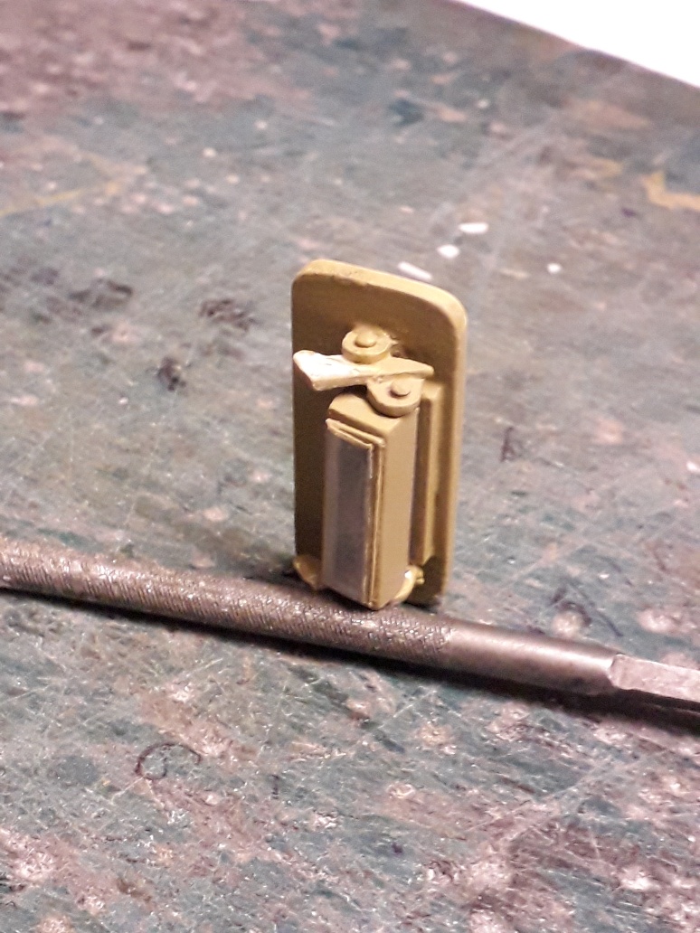 The photo shows the outer plate with the inner double hinges and the drivers armoured glass vision block which can be angled to whatever position i put the outer plate in to have correct sight line, also is a photo of the vehicles internal hinge which fits onto the arms on the port hinges, its painted on the inside prior to fitting as when fitted i wont be able to paint it without messing up the glass vision block keeping it clear.