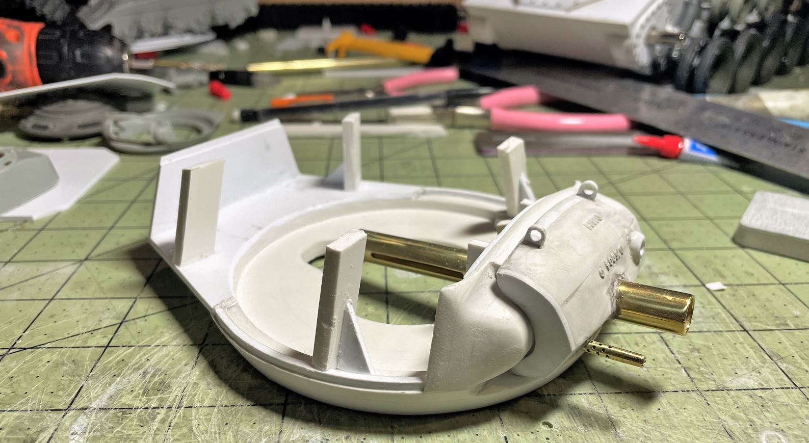 Then two hours later, the mantlet is in it definitive overall shape and ready for detailing. Test fitting with the turret mount show degrees of gun elevation consistent with the one seen on the 1/35 kit, not great but good.