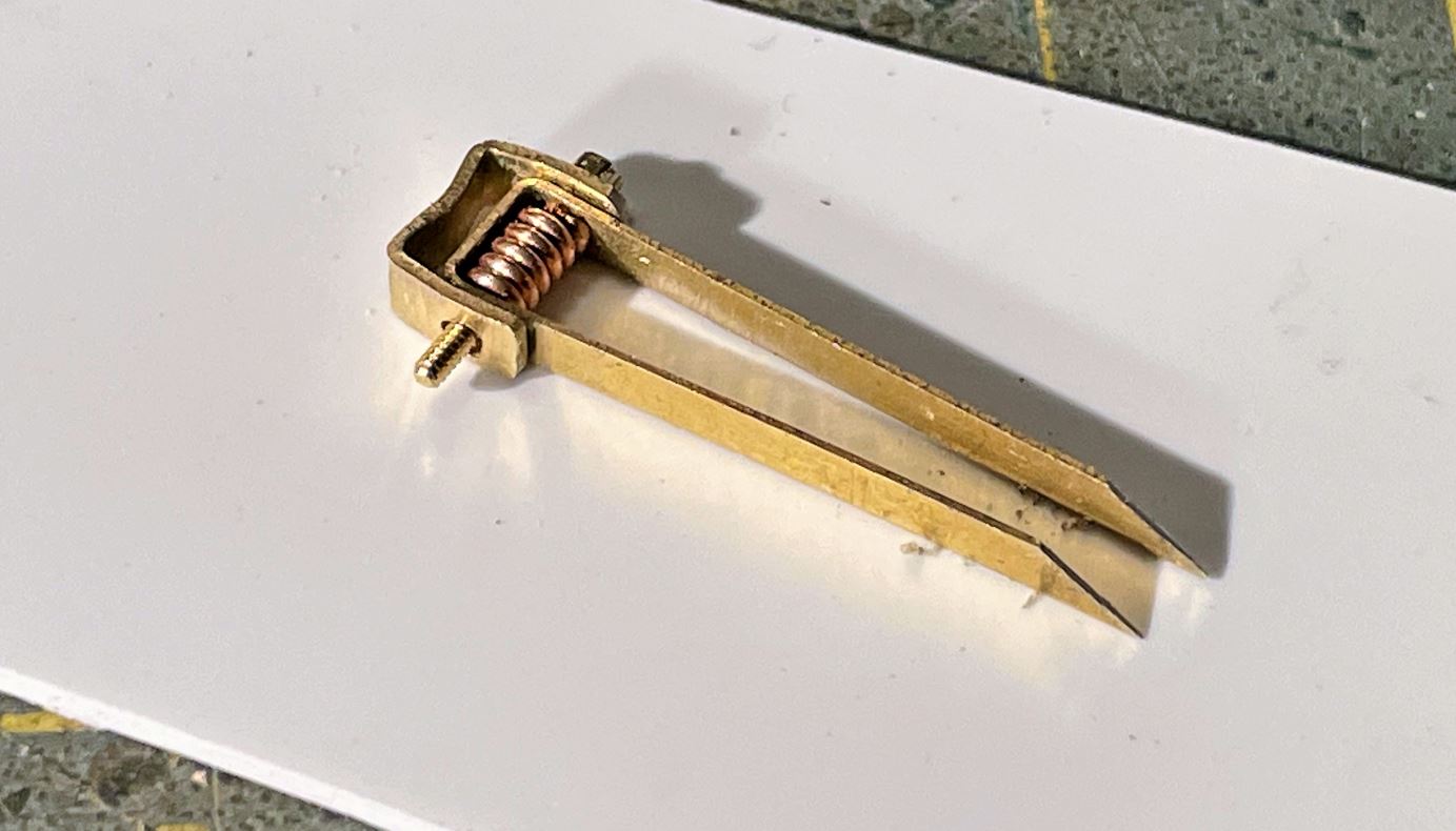 As the mount is installed on a sloped top plate, a jig was created to create and position the parts with all the proper angles (not easy), temporarily held with superglue, and then soldered in place when the proper shapes have been determined. It is critical that the middle tube section holding the cradle be absolutely vertical considering the angle of the turret top. I am junior at soldering small brass items and i had quite a bit of difficulty. The first leg is easily soldered, but when trying to solder the 2 others, the heat on the brass tube would melt the legs previously done. It gets ugly real fast, frustrating but i eventually managed. And then i had to do it twice when i noticed that the central tube i selected was externally to small. Internally, it matched the Tamiya cradle rod that slide into the tube, but the tube was not thick enough to match the outside of the cradle, i should have noticed that before. I had to add an overlay tube for the proper inner and outer diameter. Then the metal tripod is removed from the jig.