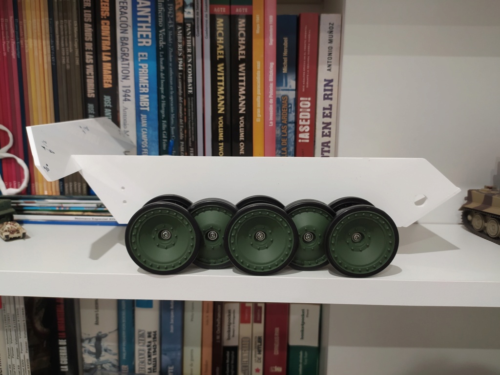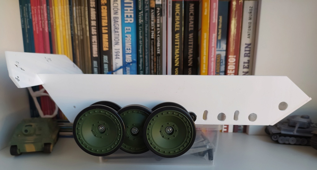I could have reduced the distance between the motor and the inner face of the hull but that would have led to the shaft sticking out more than it should, messing up the whole wheel distribution and the idler. Remember that the running gear is based on the Heng Long Panther and the distance that the shaft protrude is the same as that model, 27 millimeters (outside of the hull - end of the axle).