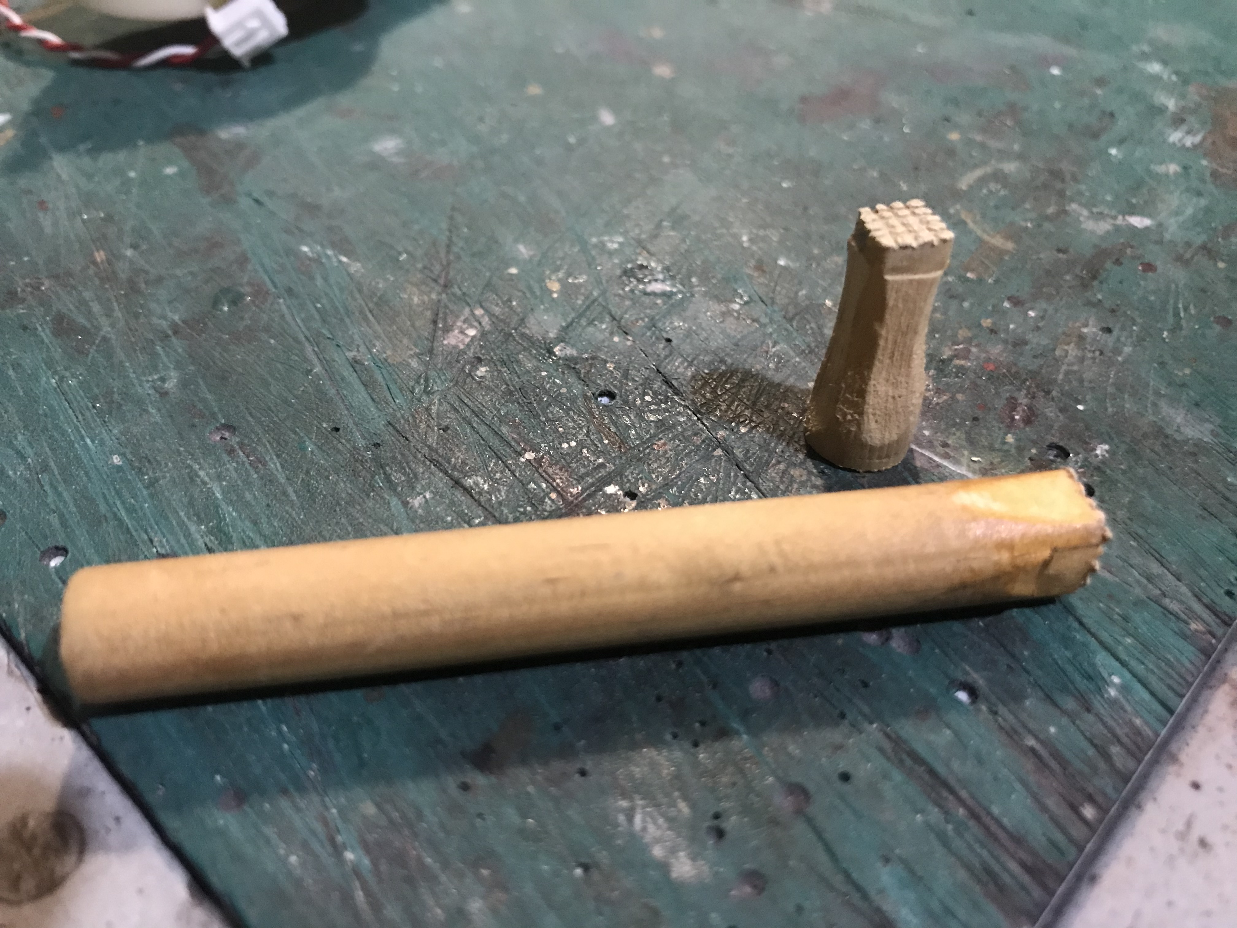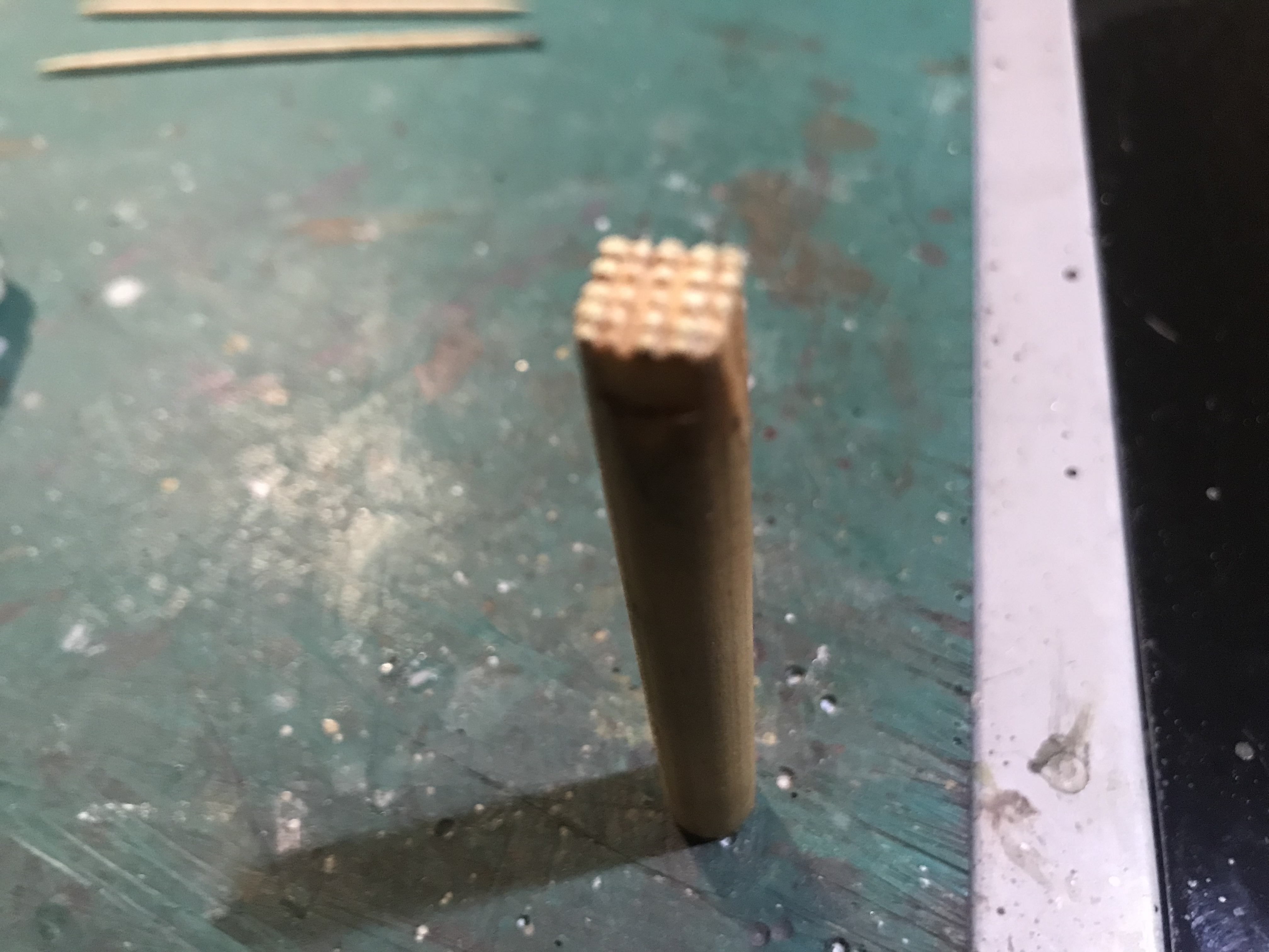 Wooden dowel hand cut with a razor saw & dressed with a fine hacksaw blade to open the gaps.
