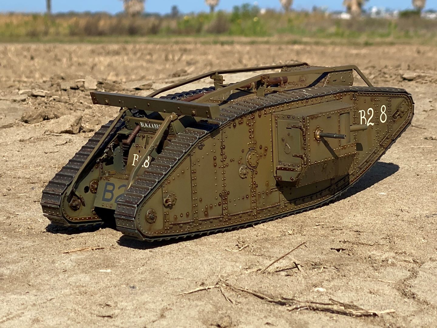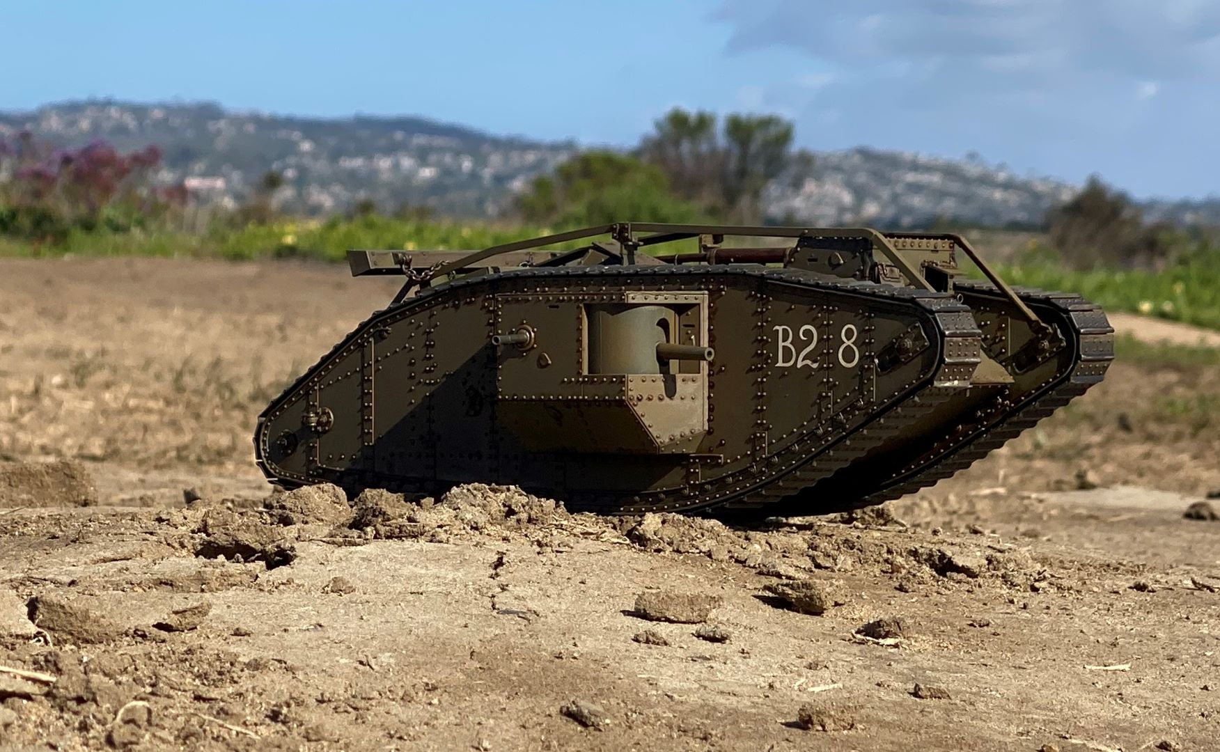 This is a 1:35 scale Tamiya model of the British Mk 4 tank. The original radio control was absolutely unusable, so I substituted electronics from a Heng Long 1:30 scale Pershing tank. This gave me sound, which the Tamiya equipment did not have; engine, cannon and machine gun noises. Of course, the sounds are "probably" not authentic, but who can remember that long ago! At least the Tamiya gearing allows slow movement.