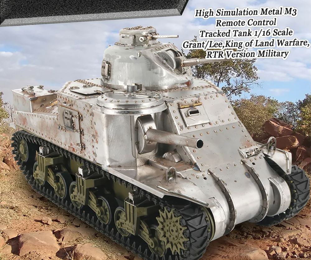 Looks like a tin can M3 upper hull mounted on top of a plastic Heng Long M4 chassis with modified suspension.