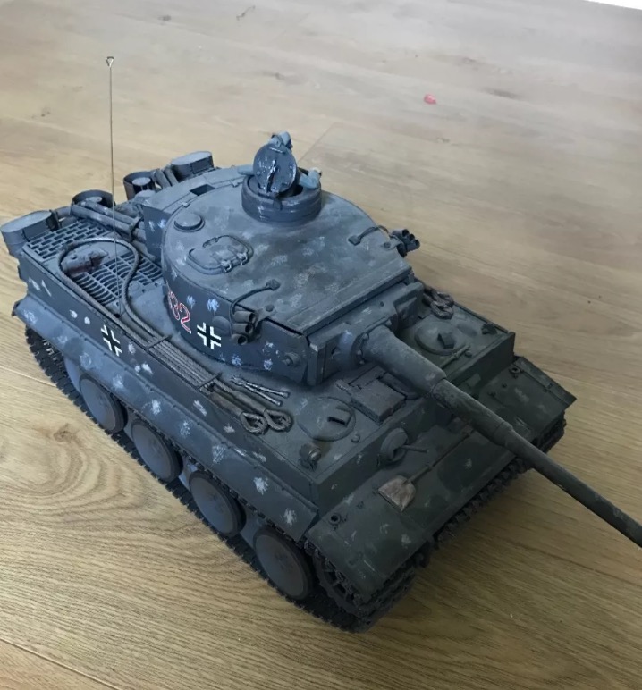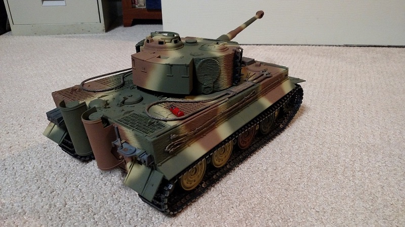 I thought I might share my latest project. I bought a tired Tamiya Tiger from Tom and wanted to turn it into a late version as I already had an early. I also love World of Tanks and I had a spare L71 in the box, so you guys know how ideas get started! I know this tank is not worthy of any historical mention, but I wanted it to look like my Tiger in the game so I up gunned her to the longer Jagdpanther barrel. When it arrived from across the pond, there was significant shipping damage. I repaired that then I then bought a host of parts from Erik at Imex who also gave me a little discount, so if you guys need parts, Erik is the guy to go too! I wanted to use the factory Tamiya wheel axels with the Taigen late metal road wheels as they are quite a bit more beefy than the Taigen and they would obviously fit the factory swing arms better, but wow what a pain. I had to bust out the Dremel and hack and polish to get them fitted and spinning freely but they work great now. I then installed the Zim and then had to fill in the gaps with the filler and screwdriver method. I installed the late hatch and turret roof parts and put on weld lines. The tank also has metal tracks from Imex and a track tensioner from ETO armor. I also bought the air vent from them as the late models did not have the bulky air cleaner boxes. I also had to make little spacers for the track hangers on the turret as they kept hitting the deck grills on the back engine compartment. The only issue I have is the flash unit is dead, but everything else works and is programed for my Spektrum DX6I. I airbrushed the camo pattern on what I have seen in game. I am quite happy with the results, so on the shelf it goes with my others!