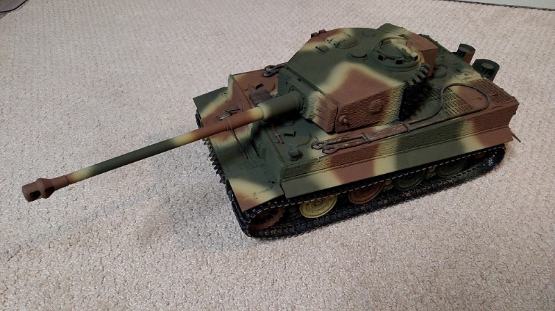 I thought I might share my latest project. I bought a tired Tamiya Tiger from Tom and wanted to turn it into a late version as I already had an early. I also love World of Tanks and I had a spare L71 in the box, so you guys know how ideas get started! I know this tank is not worthy of any historical mention, but I wanted it to look like my Tiger in the game so I up gunned her to the longer Jagdpanther barrel. When it arrived from across the pond, there was significant shipping damage. I repaired that then I then bought a host of parts from Erik at Imex who also gave me a little discount, so if you guys need parts, Erik is the guy to go too! I wanted to use the factory Tamiya wheel axels with the Taigen late metal road wheels as they are quite a bit more beefy than the Taigen and they would obviously fit the factory swing arms better, but wow what a pain. I had to bust out the Dremel and hack and polish to get them fitted and spinning freely but they work great now. I then installed the Zim and then had to fill in the gaps with the filler and screwdriver method. I installed the late hatch and turret roof parts and put on weld lines. The tank also has metal tracks from Imex and a track tensioner from ETO armor. I also bought the air vent from them as the late models did not have the bulky air cleaner boxes. I also had to make little spacers for the track hangers on the turret as they kept hitting the deck grills on the back engine compartment. The only issue I have is the flash unit is dead, but everything else works and is programed for my Spektrum DX6I. I airbrushed the camo pattern on what I have seen in game. I am quite happy with the results, so on the shelf it goes with my others!