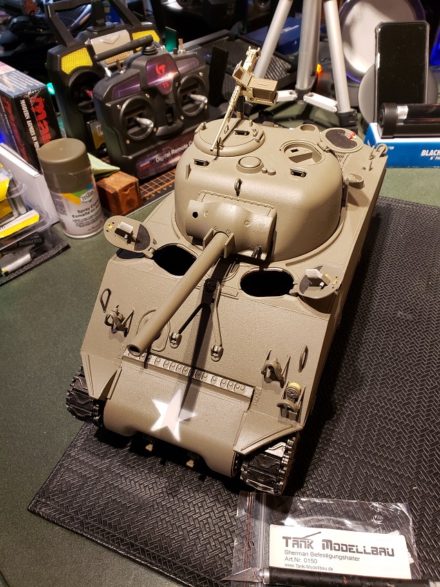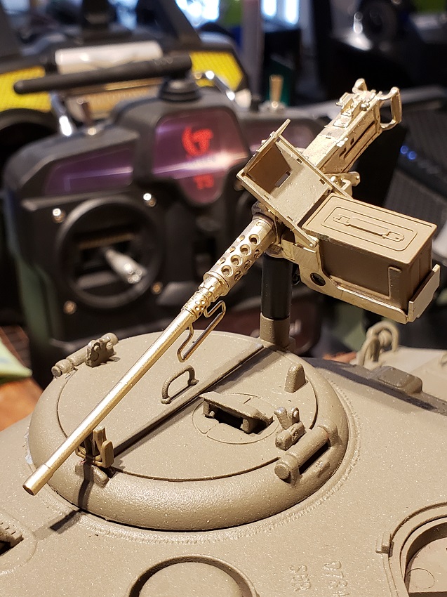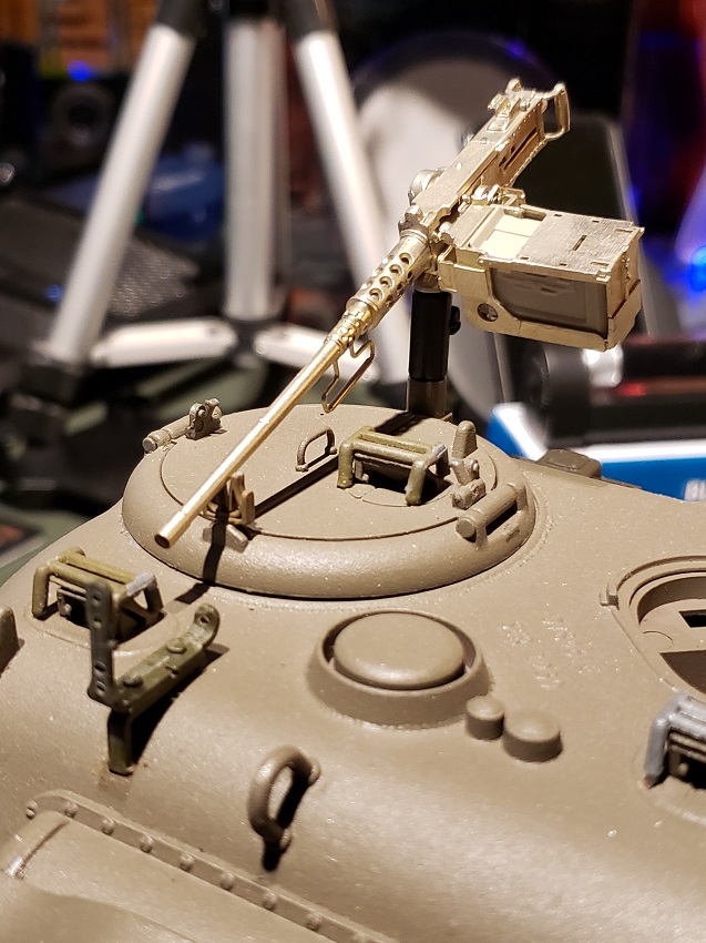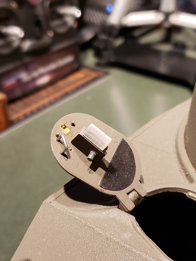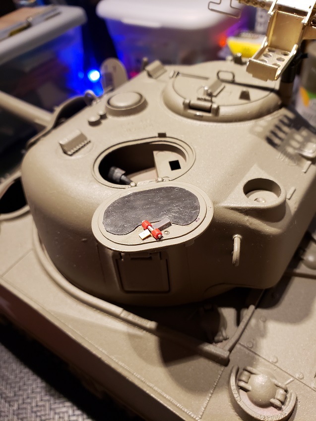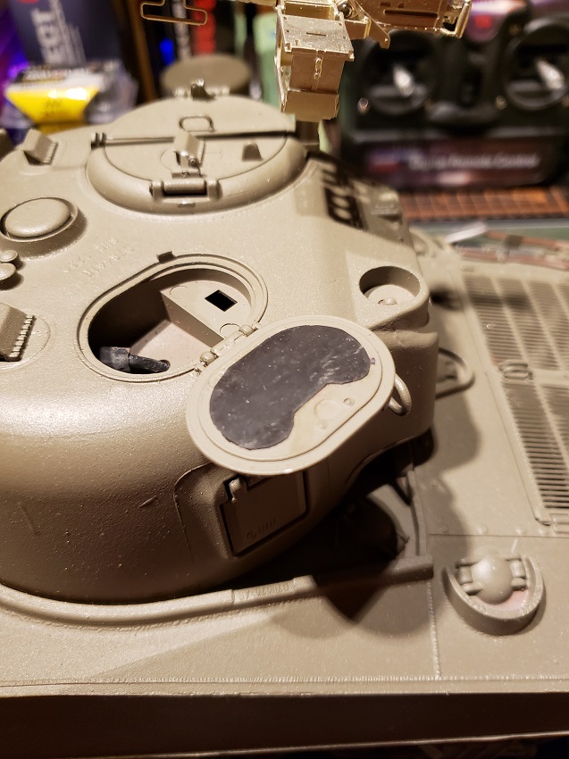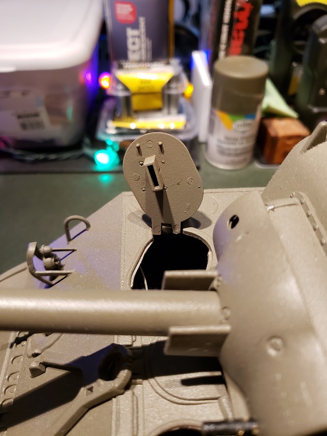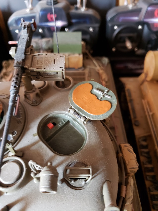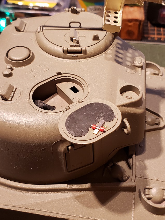 Got a few hours to work on the Build while the Spouse streamed online. Today was hatches and turret detail fun. I wanted to do something to the plain jane hatch interiors that Mato provides with these tanks. I had sufficient scrap and spares of all imaginable types and configuration to detail the underside of the Loaders, Drivers and Aux Drivers hatches. I added some periscope protection on the turret ( left over MATO periscope guards ) and replaced the vane type Commanders manual rangefinder with a later type. I considered adding the mounts for the raincover over the main gun mantlet and trunnions but could find no photograph or illustration showing their positioning. Maybe this main gun was sealed against the elements unlike the 105mm mounted on 'Maxene'. Inspiration came from this site, one that I have used before for Sherman Builds: http://the.shadock.free.fr/sherman_minu ... 3_75w.html I found the last of my resin 50.cal cans in the open configuration. A little sanding was needed to get one to fit in the metal M2's tray but it will look great with the brass ammo when I return to it. Definitely better than the closed HL Can I tested it with... Next up, the interior of the Commander's hatch and testing the new IR Jagdpanther Upper.