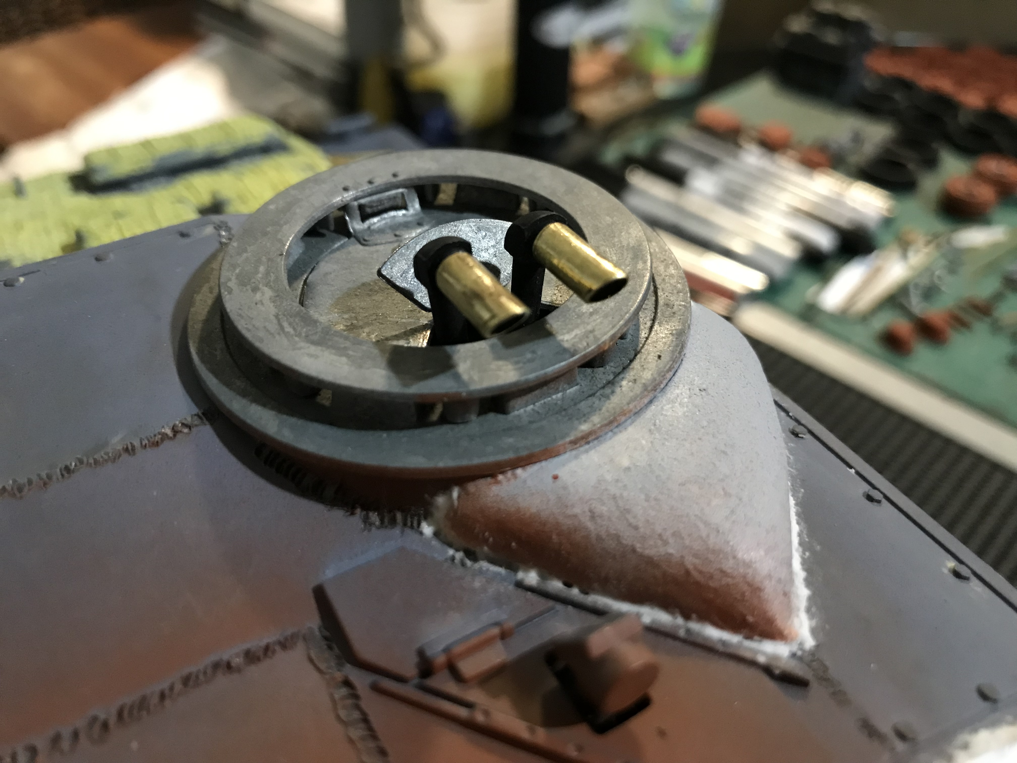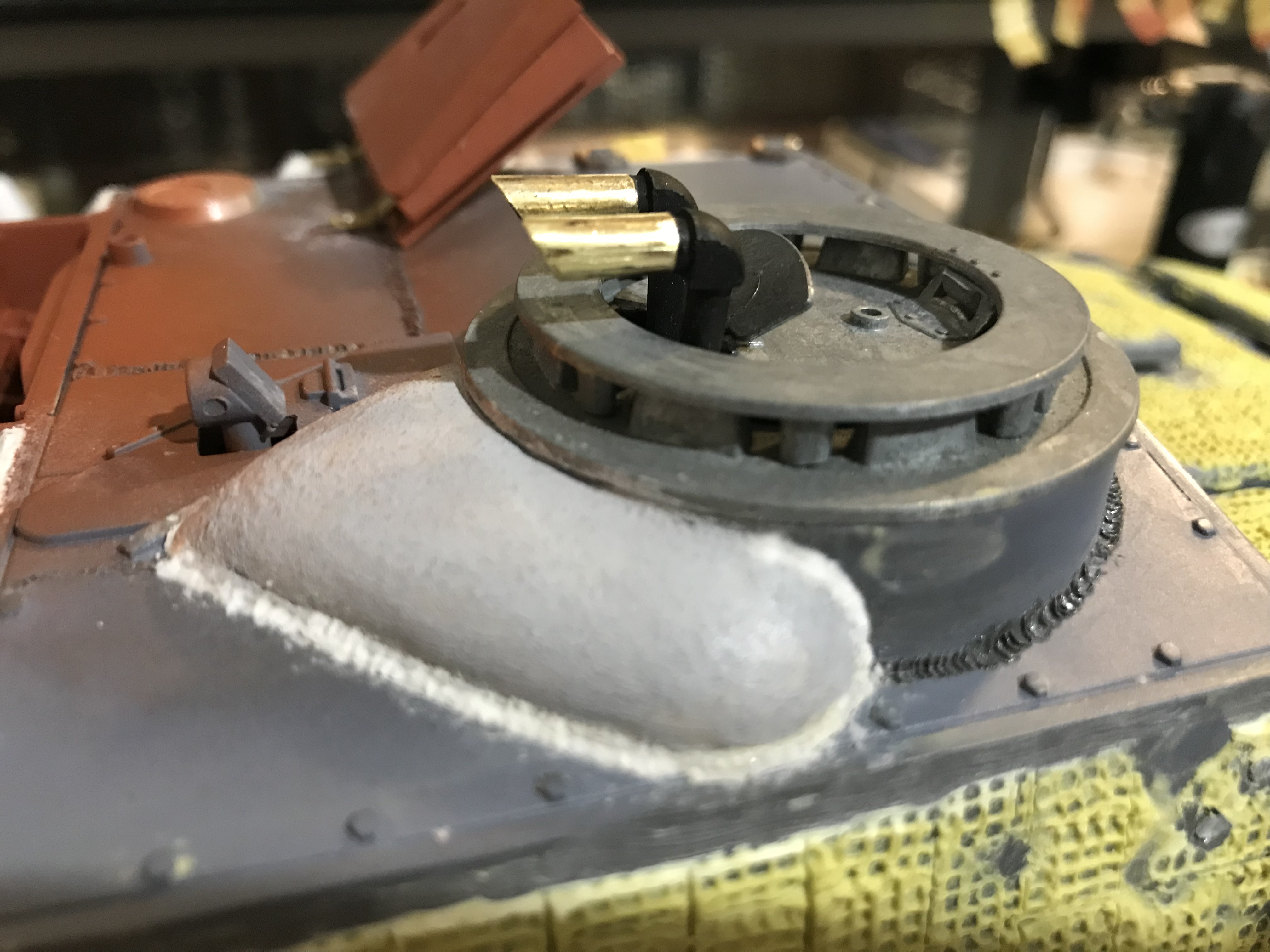I noticed some pin holes in the resin mantlet that only showed up after first primer coat so covered them with a thick texture of Mr Surfacer 500 paste , a dash of primer - problem solved.