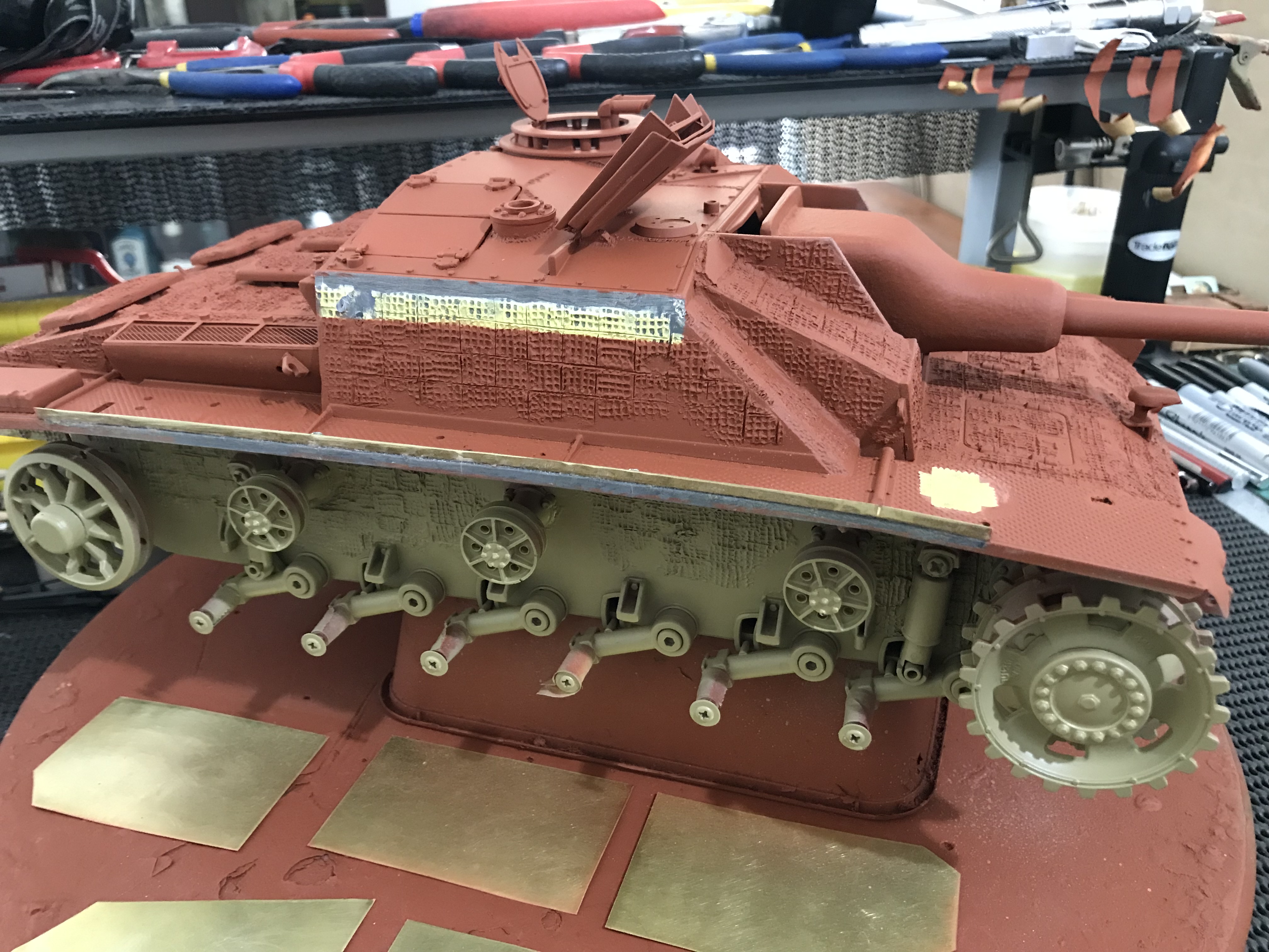 Got the urge to sniff chemicals(hey-it is the "StuG-life" way ) so outside it want to get some TS3 spray on the lower hull sides & roadwheels.