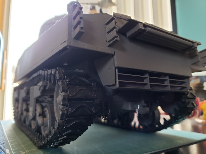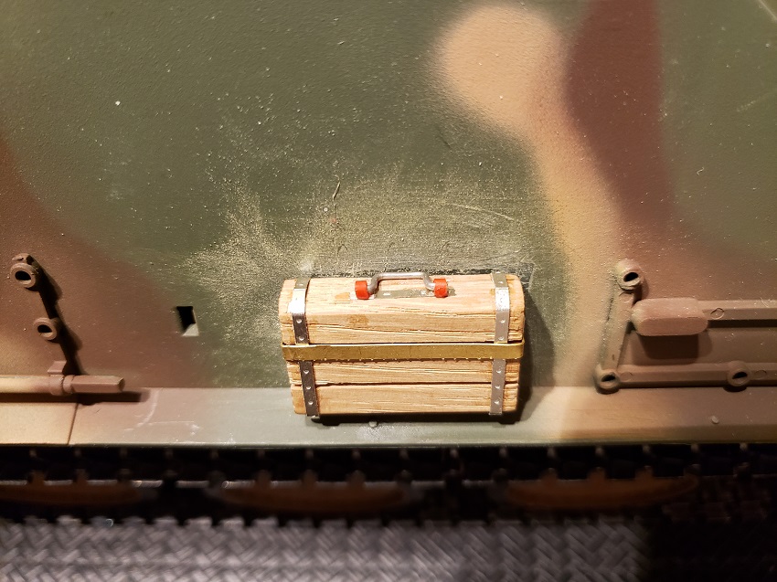 Thats another vote for use of the wooden block. ( It was purchased from Tank Modelbau and I will be adding the handle and strapping to it if it wins the informal vote. ) The color of the Muzzle Brake is due to the ring I added to correct the internal diameter of the Brake. The entire vehicle will be painted once the detailing is complete.