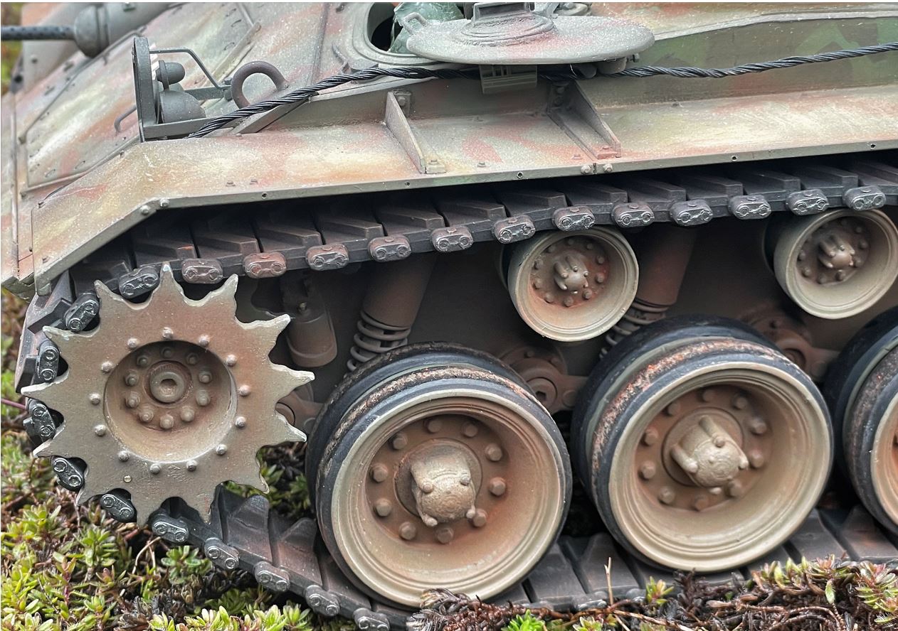 - Modified double pin Heng Long Sherman metal tracks into Chaffee T85E1 tracks with central guide with rubber shoe