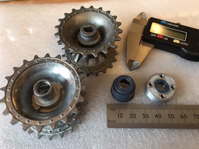 The Taigen chassis needs axles not screws, so pack of them from eBay (£8), then you need axles for the idler wheels but no one does those alone (?) not even from the east in slow post, so bought the Taigen sprockets and idlers from forgebear with the chassis.